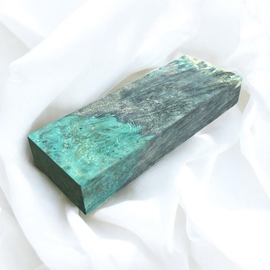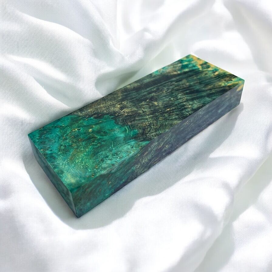 また、樹脂に着色をする事で、木材内部の密度の違いや含水率の違いにより浸透する箇所と浸透しない箇所が現れ、鮮やかで複雑な模様となります。その鮮やかさや強度からナイフハンドルやペンブランクなどに、よく使用されます。