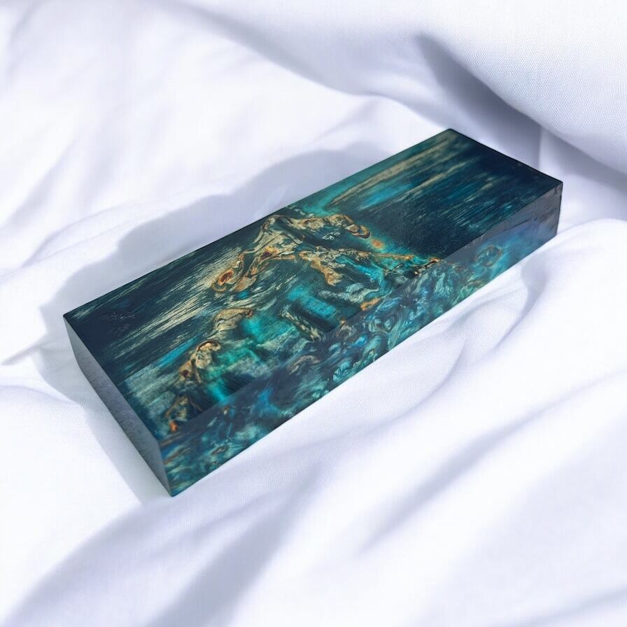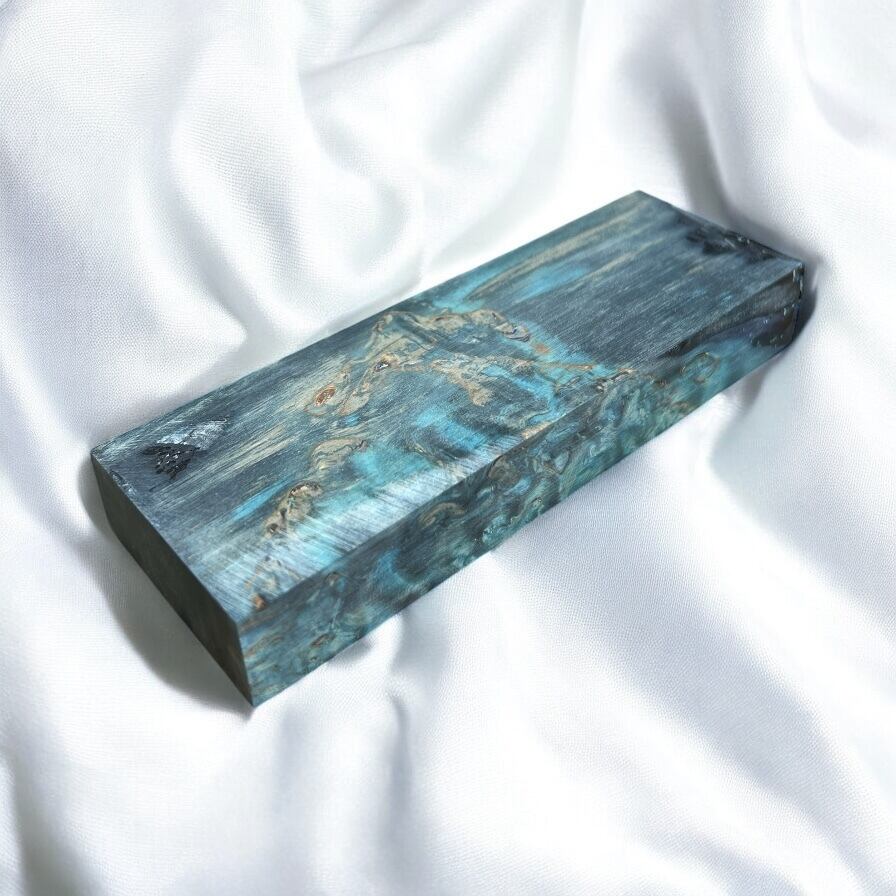 また、樹脂に着色をする事で、木材内部の密度の違いや含水率の違いにより浸透する箇所と浸透しない箇所が現れ、鮮やかで複雑な模様となります。その鮮やかさや強度からナイフハンドルやペンブランクなどに、よく使用されます。