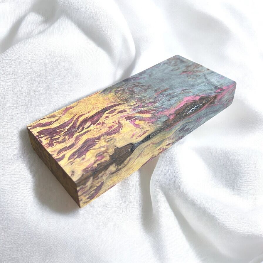 また、樹脂に着色をする事で、木材内部の密度の違いや含水率の違いにより浸透する箇所と浸透しない箇所が現れ、鮮やかで複雑な模様となります。その鮮やかさや強度からナイフハンドルやペンブランクなどに、よく使用されます。