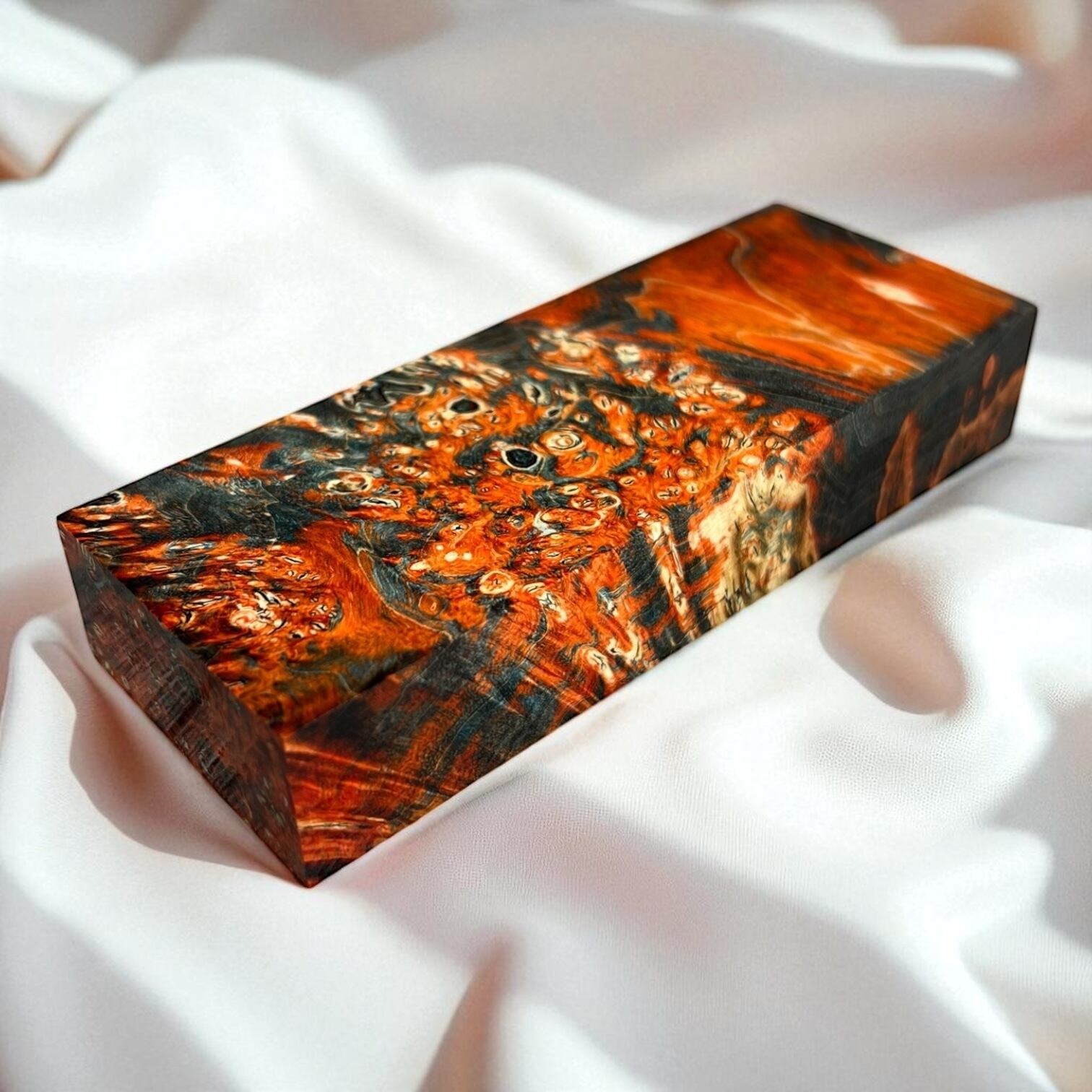 また、樹脂に着色をする事で、木材内部の密度の違いや含水率の違いにより浸透する箇所と浸透しない箇所が現れ、鮮やかで複雑な模様となります。その鮮やかさや強度からナイフハンドルやペンブランクなどに、よく使用されます。