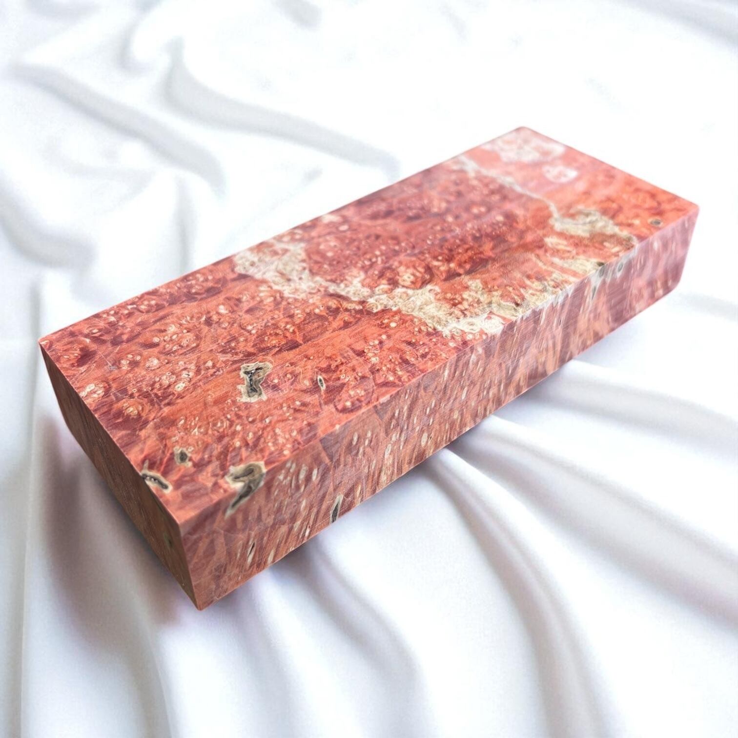 また、樹脂に着色をする事で、木材内部の密度の違いや含水率の違いにより浸透する箇所と浸透しない箇所が現れ、鮮やかで複雑な模様となります。その鮮やかさや強度からナイフハンドルやペンブランクなどに、よく使用されます。