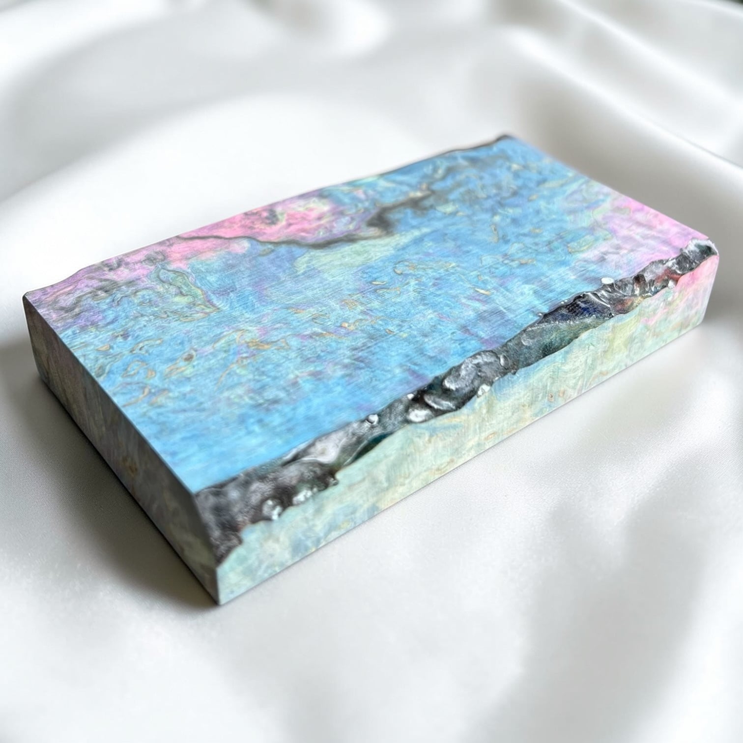 また、樹脂に着色をする事で、木材内部の密度の違いや含水率の違いにより浸透する箇所と浸透しない箇所が現れ、鮮やかで複雑な模様となります。その鮮やかさや強度からナイフハンドルやペンブランクなどに、よく使用されます。