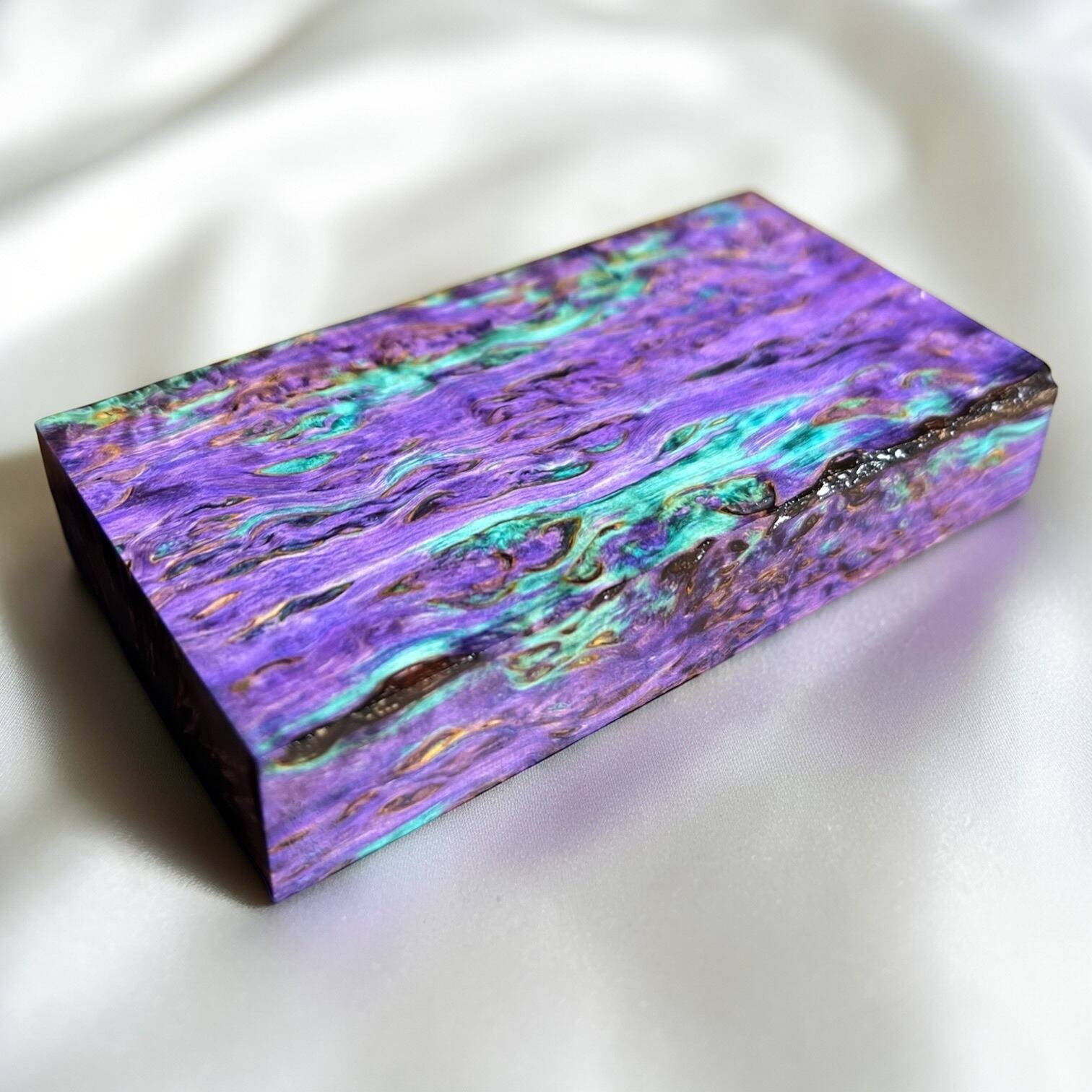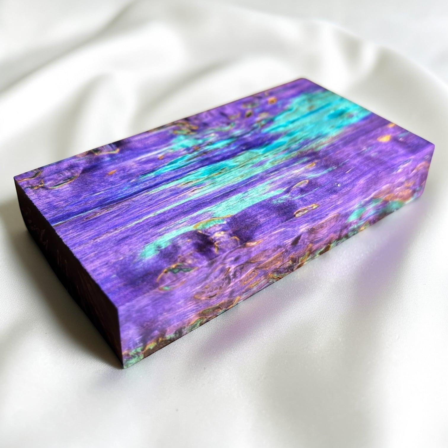 また、樹脂に着色をする事で、木材内部の密度の違いや含水率の違いにより浸透する箇所と浸透しない箇所が現れ、鮮やかで複雑な模様となります。その鮮やかさや強度からナイフハンドルやペンブランクなどに、よく使用されます。