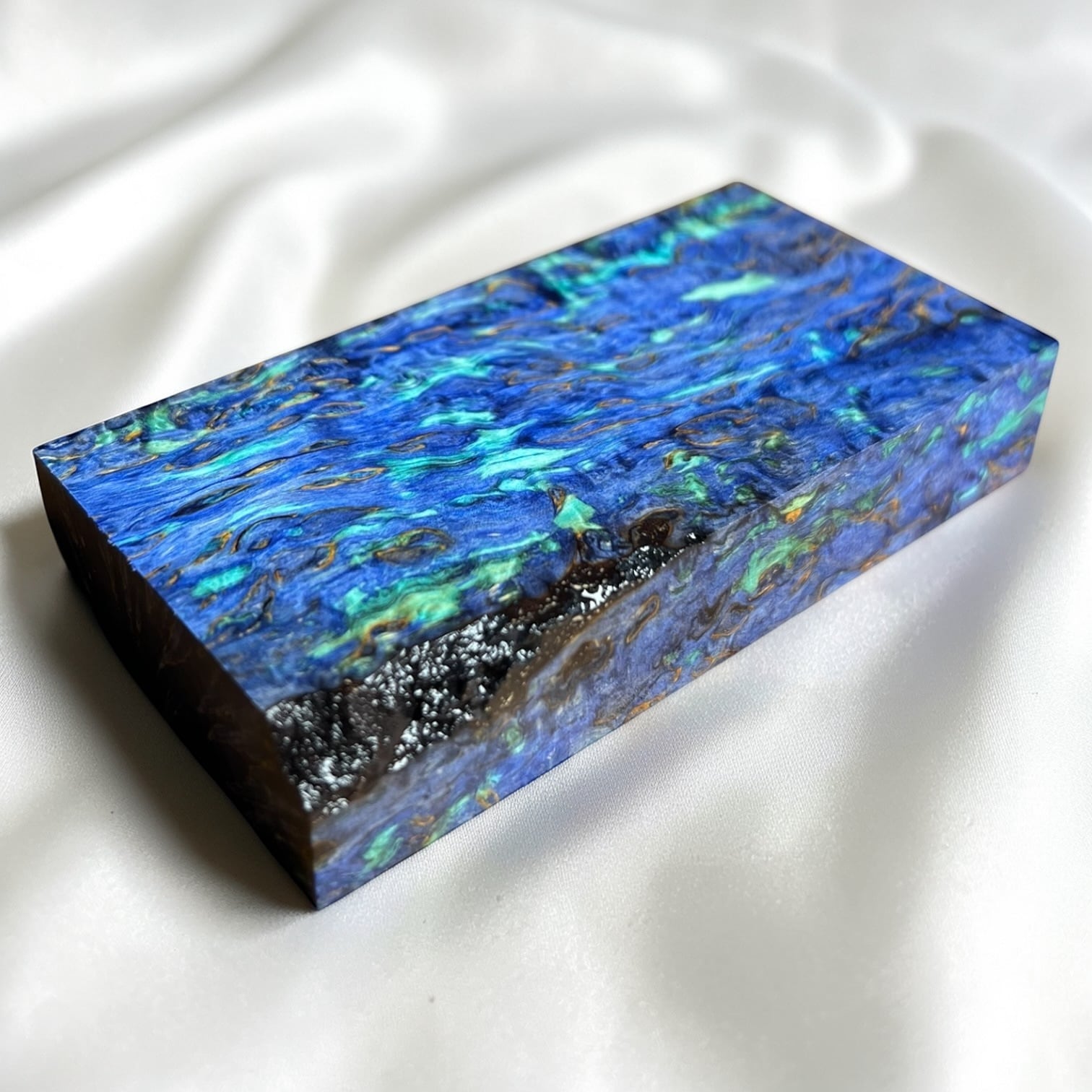 また、樹脂に着色をする事で、木材内部の密度の違いや含水率の違いにより浸透する箇所と浸透しない箇所が現れ、鮮やかで複雑な模様となります。その鮮やかさや強度からナイフハンドルやペンブランクなどに、よく使用されます。
