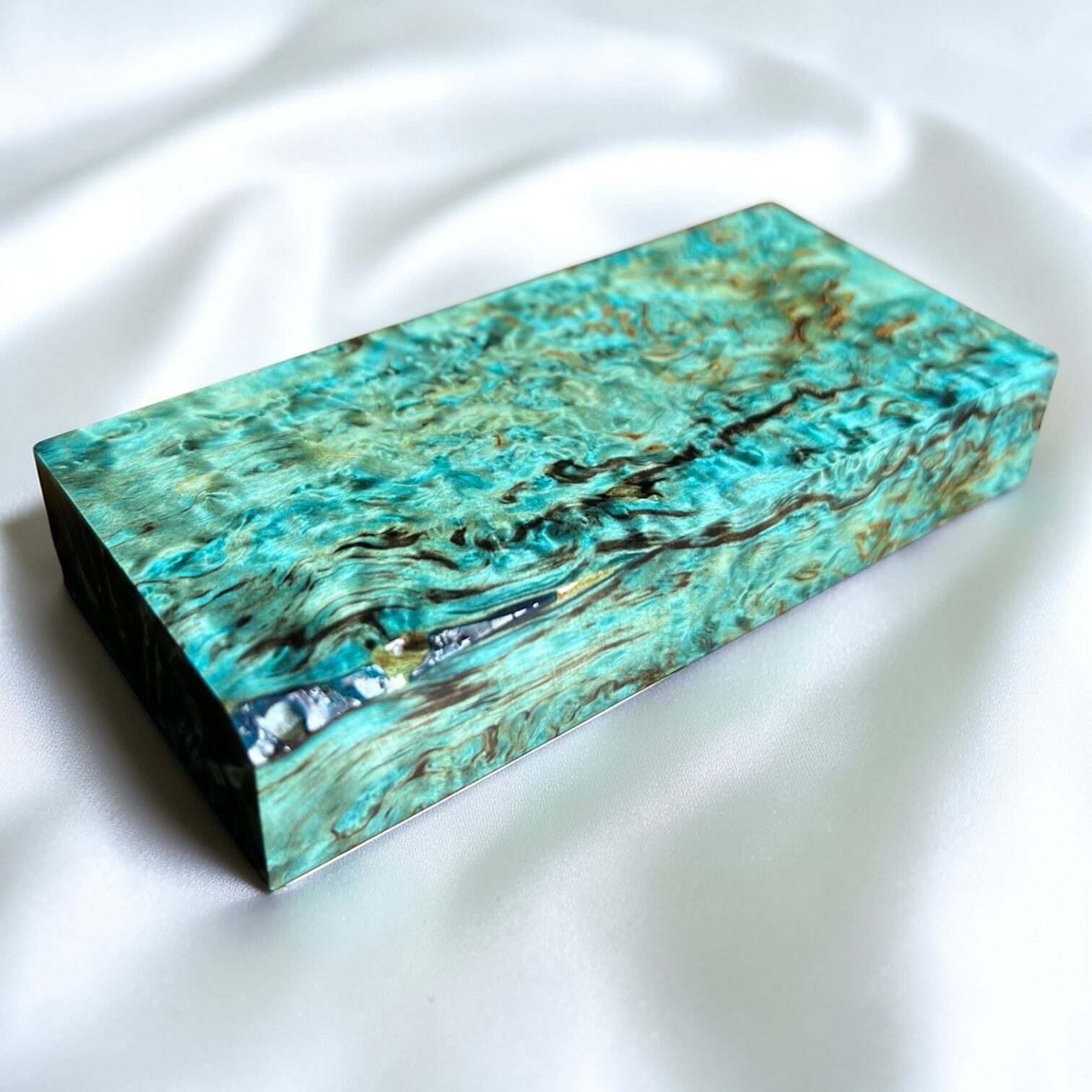また、樹脂に着色をする事で、木材内部の密度の違いや含水率の違いにより浸透する箇所と浸透しない箇所が現れ、鮮やかで複雑な模様となります。その鮮やかさや強度からナイフハンドルやペンブランクなどに、よく使用されます。