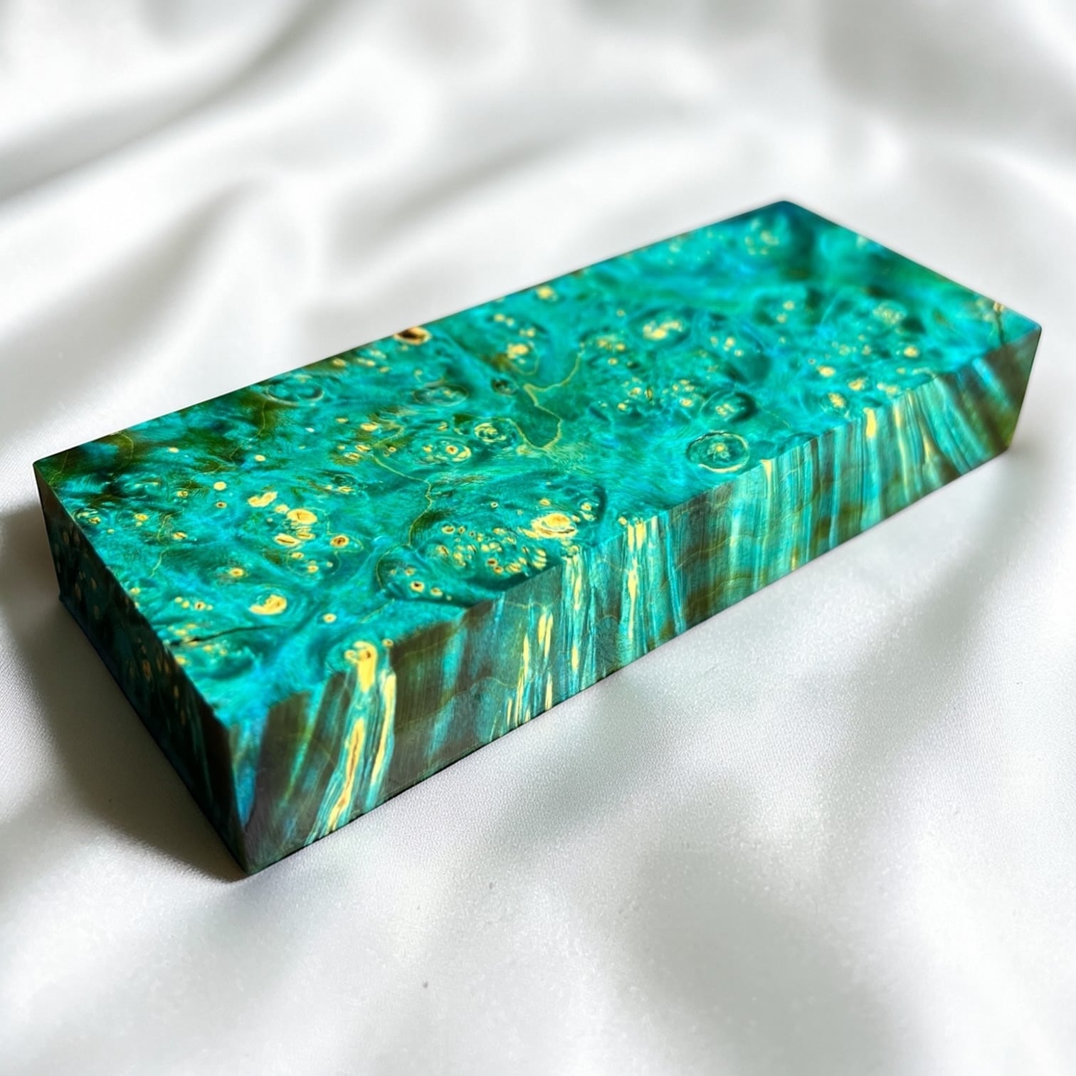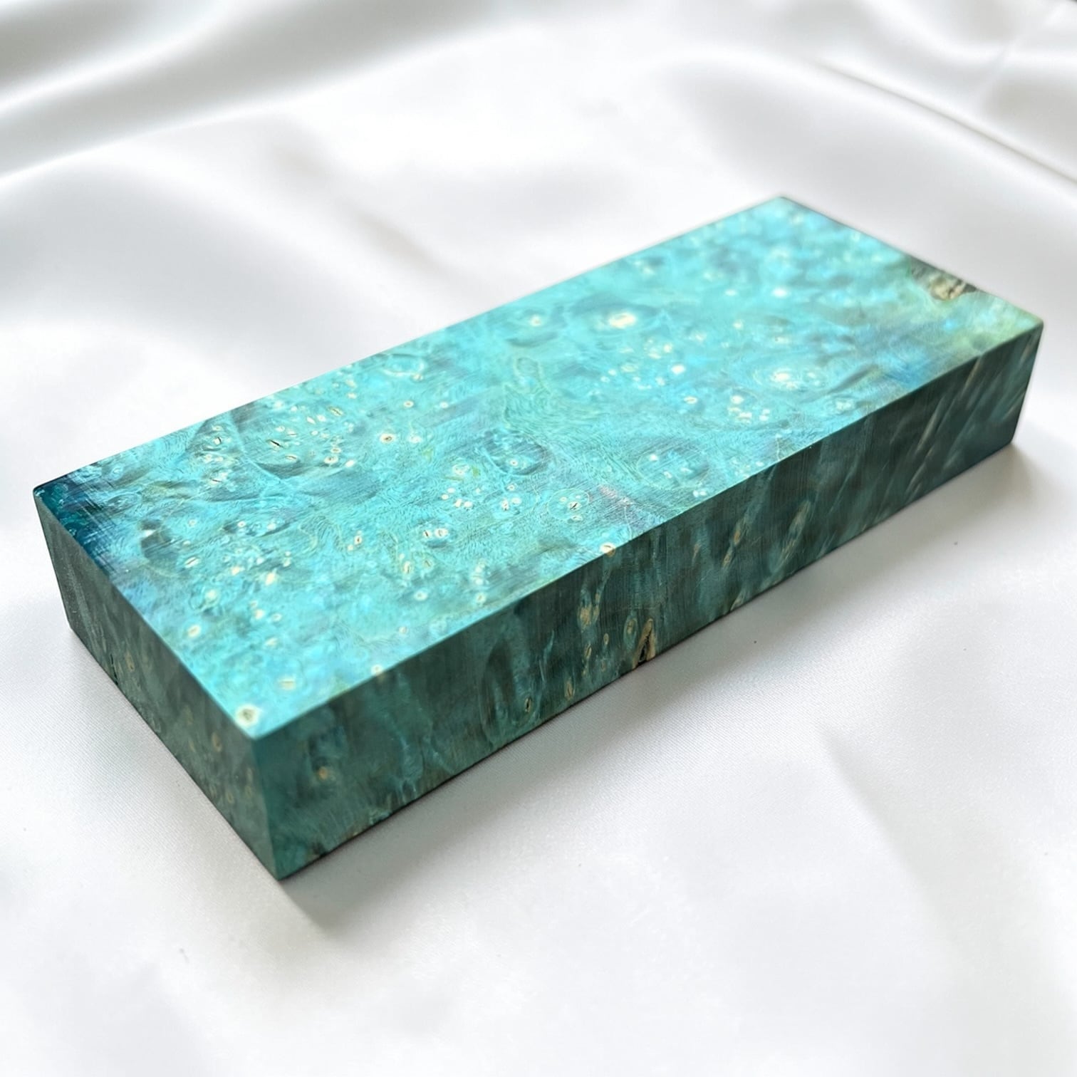 また、樹脂に着色をする事で、木材内部の密度の違いや含水率の違いにより浸透する箇所と浸透しない箇所が現れ、鮮やかで複雑な模様となります。その鮮やかさや強度からナイフハンドルやペンブランクなどに、よく使用されます。