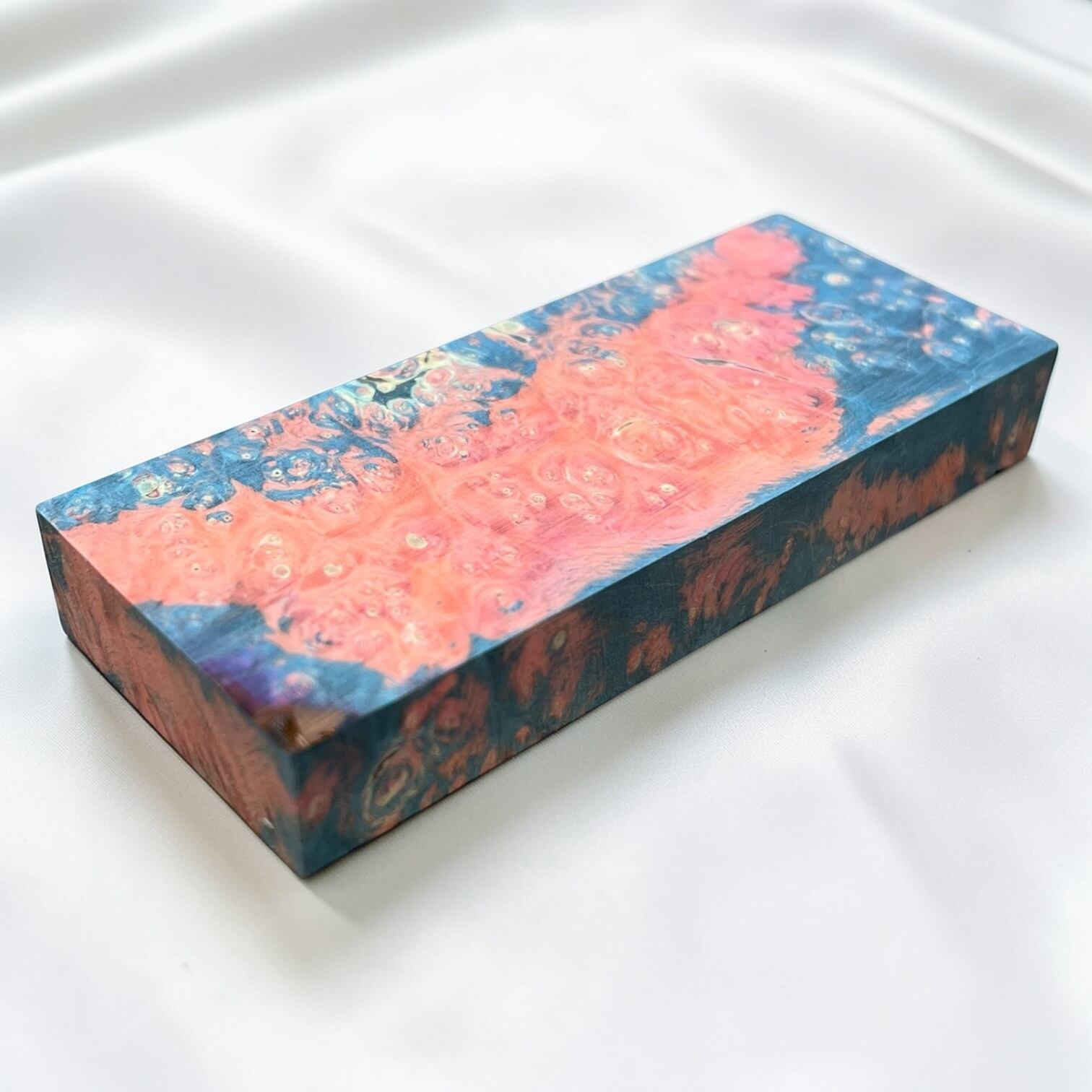 また、樹脂に着色をする事で、木材内部の密度の違いや含水率の違いにより浸透する箇所と浸透しない箇所が現れ、鮮やかで複雑な模様となります。その鮮やかさや強度からナイフハンドルやペンブランクなどに、よく使用されます。