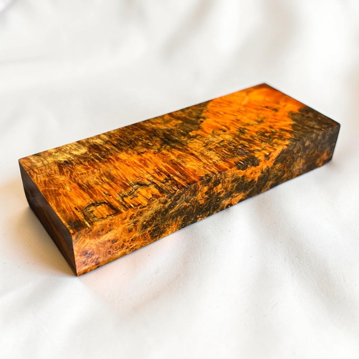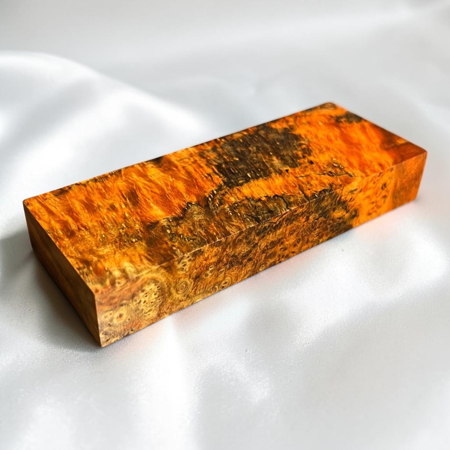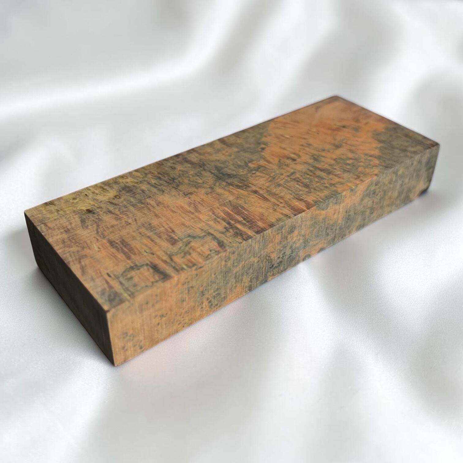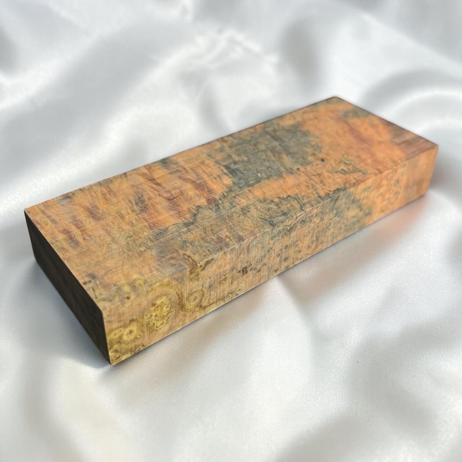 また、樹脂に着色をする事で、木材内部の密度の違いや含水率の違いにより浸透する箇所と浸透しない箇所が現れ、鮮やかで複雑な模様となります。その鮮やかさや強度からナイフハンドルやペンブランクなどに、よく使用されます。