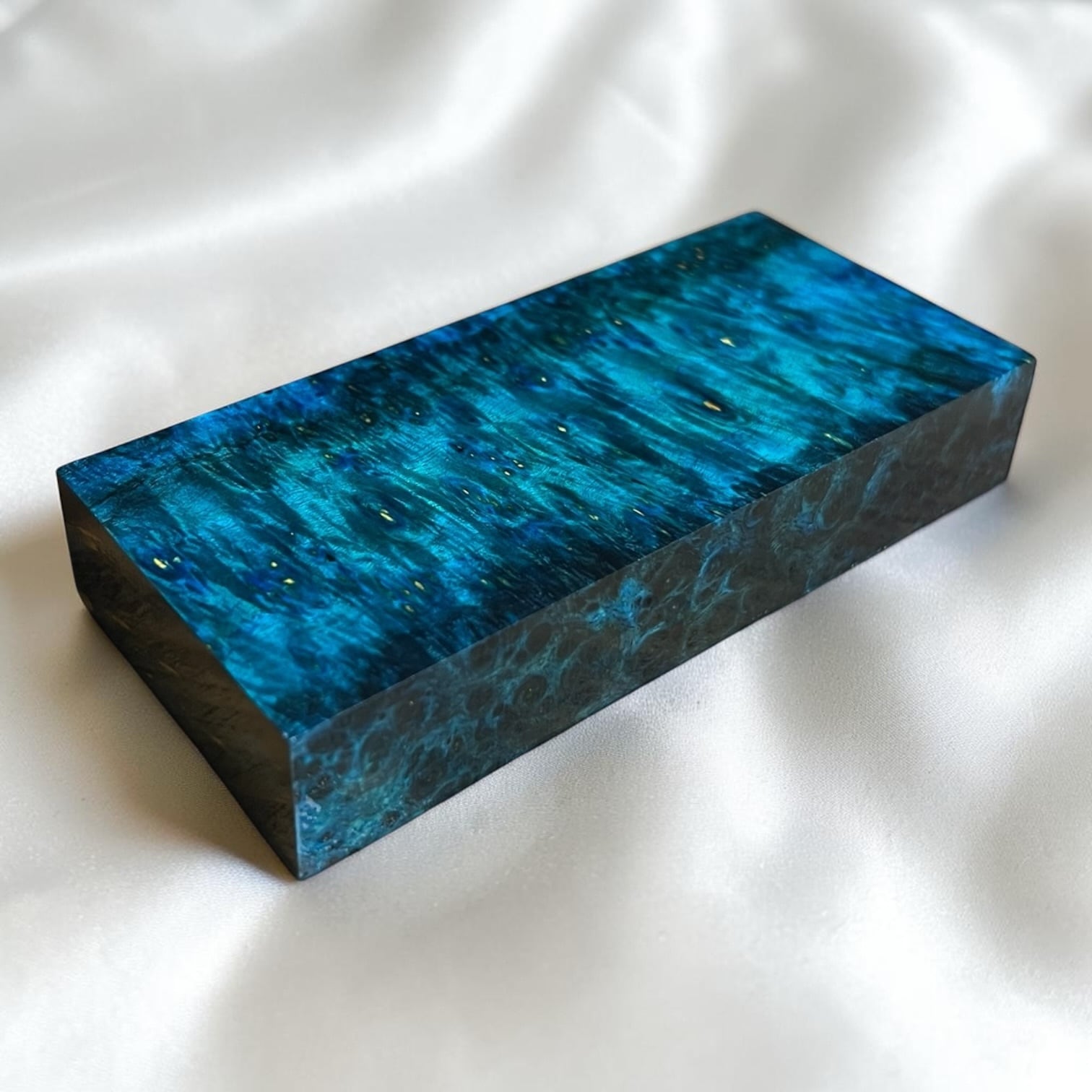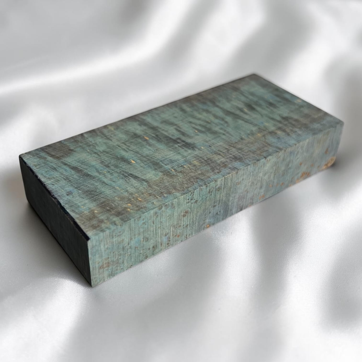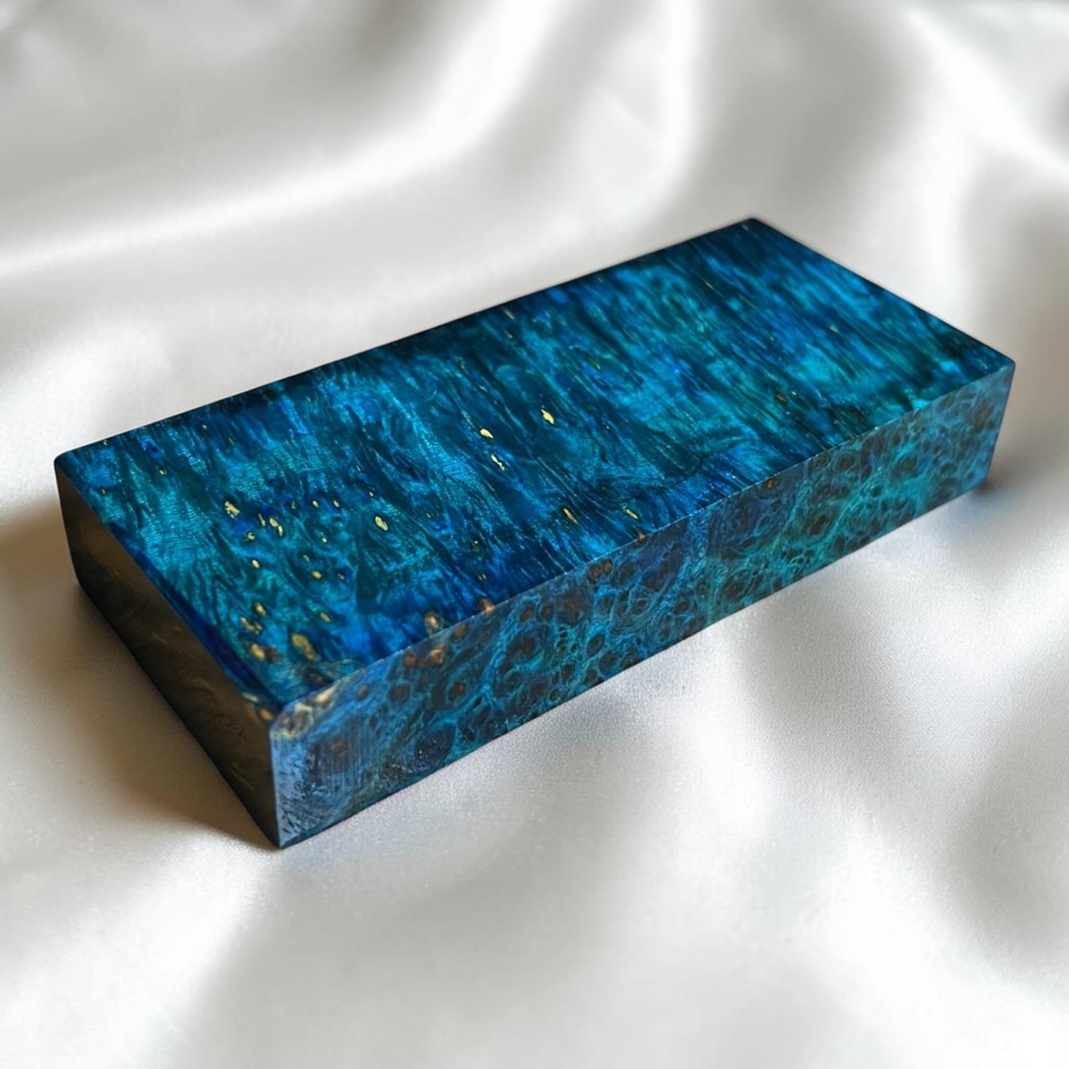 また、樹脂に着色をする事で、木材内部の密度の違いや含水率の違いにより浸透する箇所と浸透しない箇所が現れ、鮮やかで複雑な模様となります。その鮮やかさや強度からナイフハンドルやペンブランクなどに、よく使用されます。