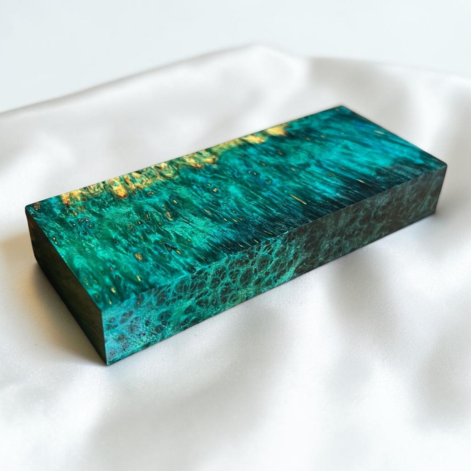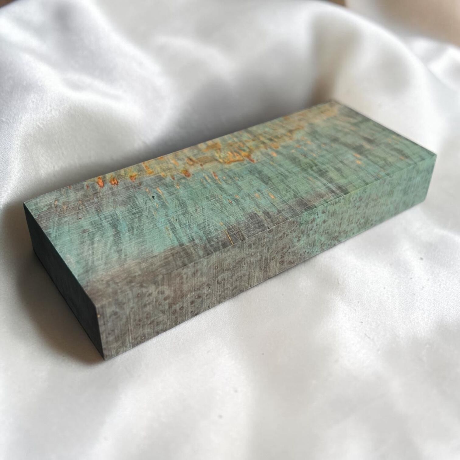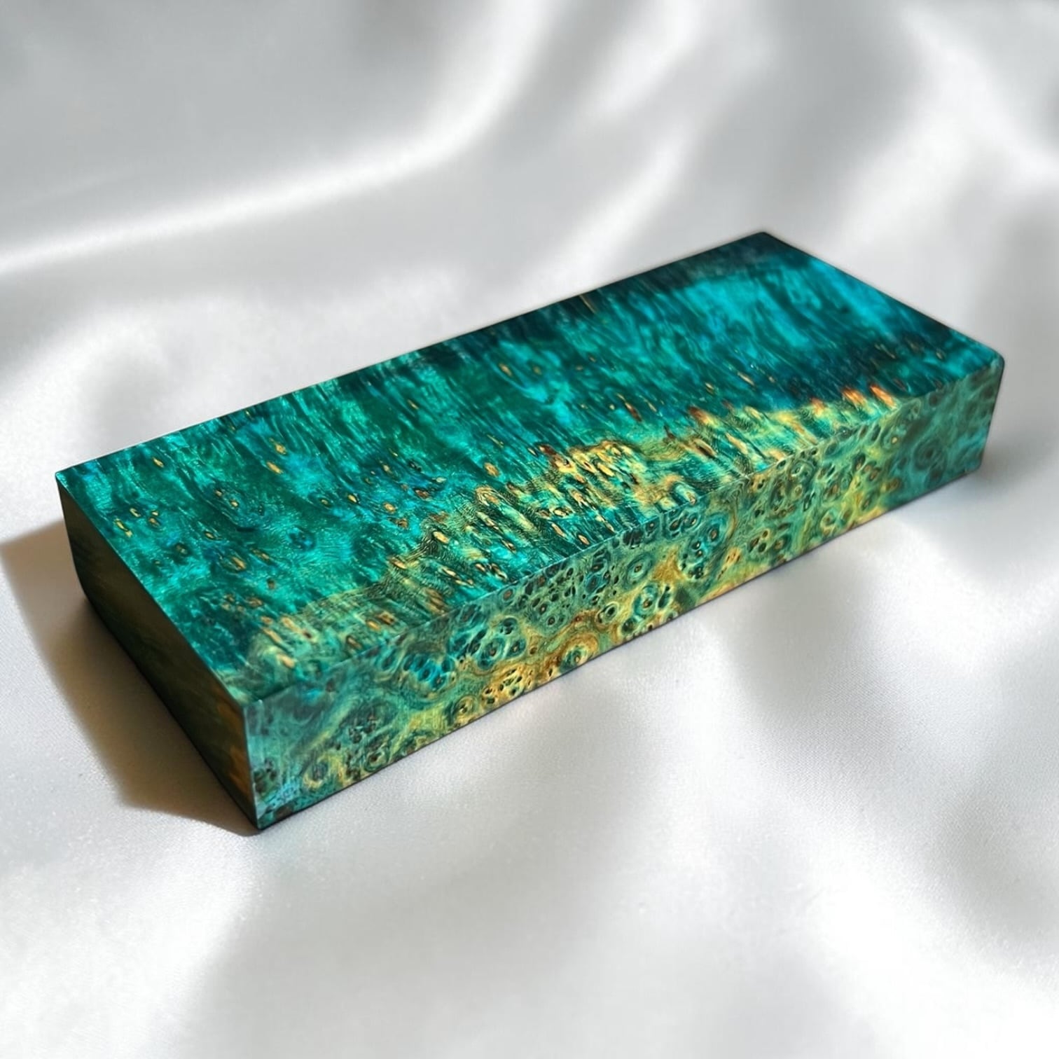 また、樹脂に着色をする事で、木材内部の密度の違いや含水率の違いにより浸透する箇所と浸透しない箇所が現れ、鮮やかで複雑な模様となります。その鮮やかさや強度からナイフハンドルやペンブランクなどに、よく使用されます。