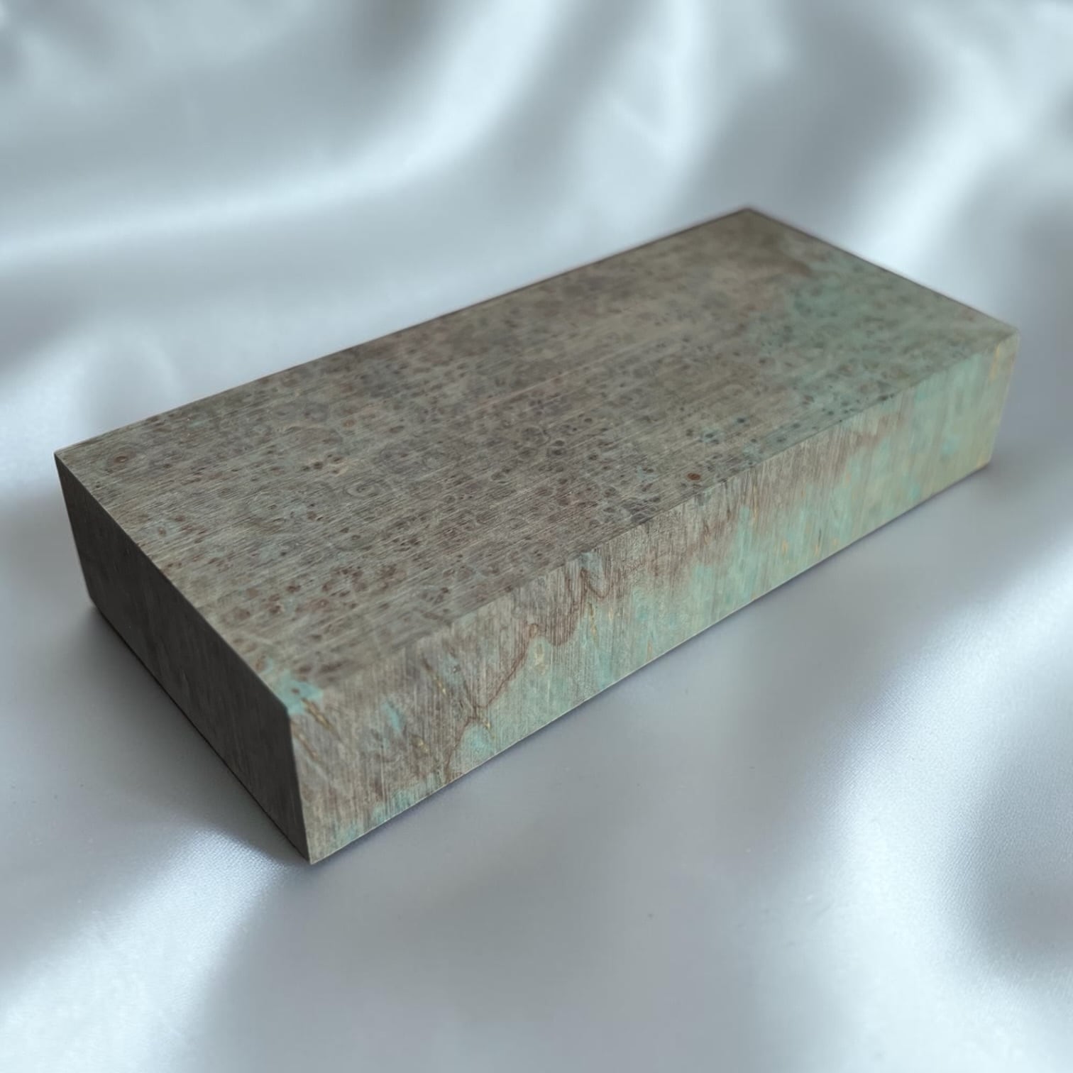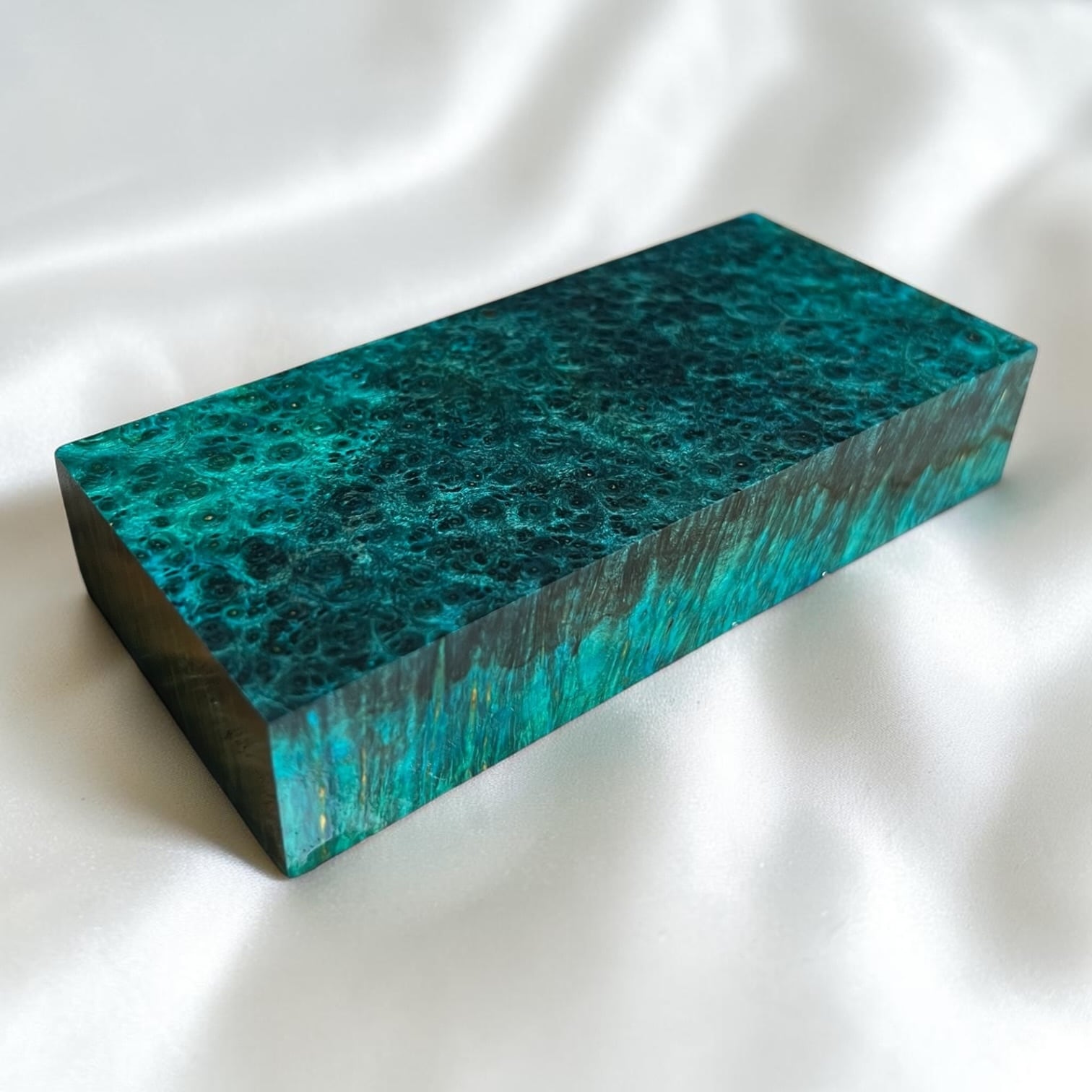 また、樹脂に着色をする事で、木材内部の密度の違いや含水率の違いにより浸透する箇所と浸透しない箇所が現れ、鮮やかで複雑な模様となります。その鮮やかさや強度からナイフハンドルやペンブランクなどに、よく使用されます。