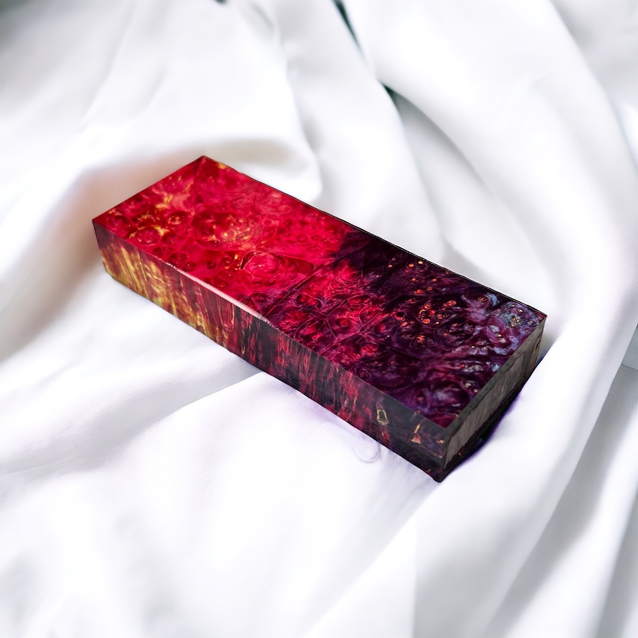 また、樹脂に着色をする事で、木材内部の密度の違いや含水率の違いにより浸透する箇所と浸透しない箇所が現れ、鮮やかで複雑な模様となります。その鮮やかさや強度からナイフハンドルやペンブランクなどに、よく使用されます。