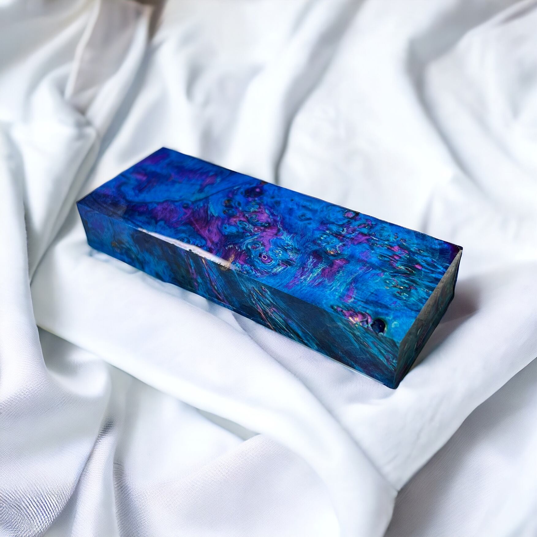 また、樹脂に着色をする事で、木材内部の密度の違いや含水率の違いにより浸透する箇所と浸透しない箇所が現れ、鮮やかで複雑な模様となります。その鮮やかさや強度からナイフハンドルやペンブランクなどに、よく使用されます。