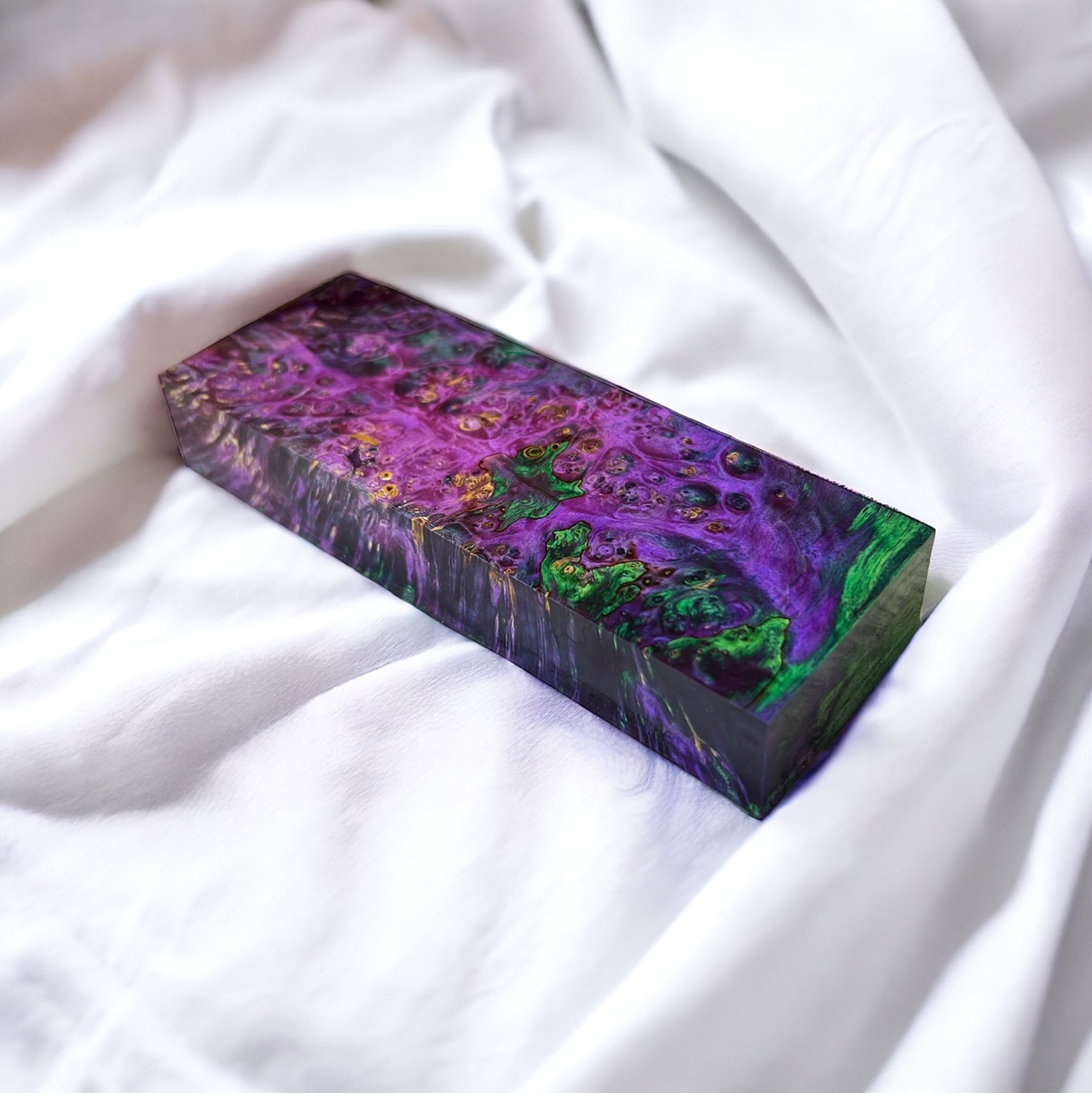 また、樹脂に着色をする事で、木材内部の密度の違いや含水率の違いにより浸透する箇所と浸透しない箇所が現れ、鮮やかで複雑な模様となります。その鮮やかさや強度からナイフハンドルやペンブランクなどに、よく使用されます。