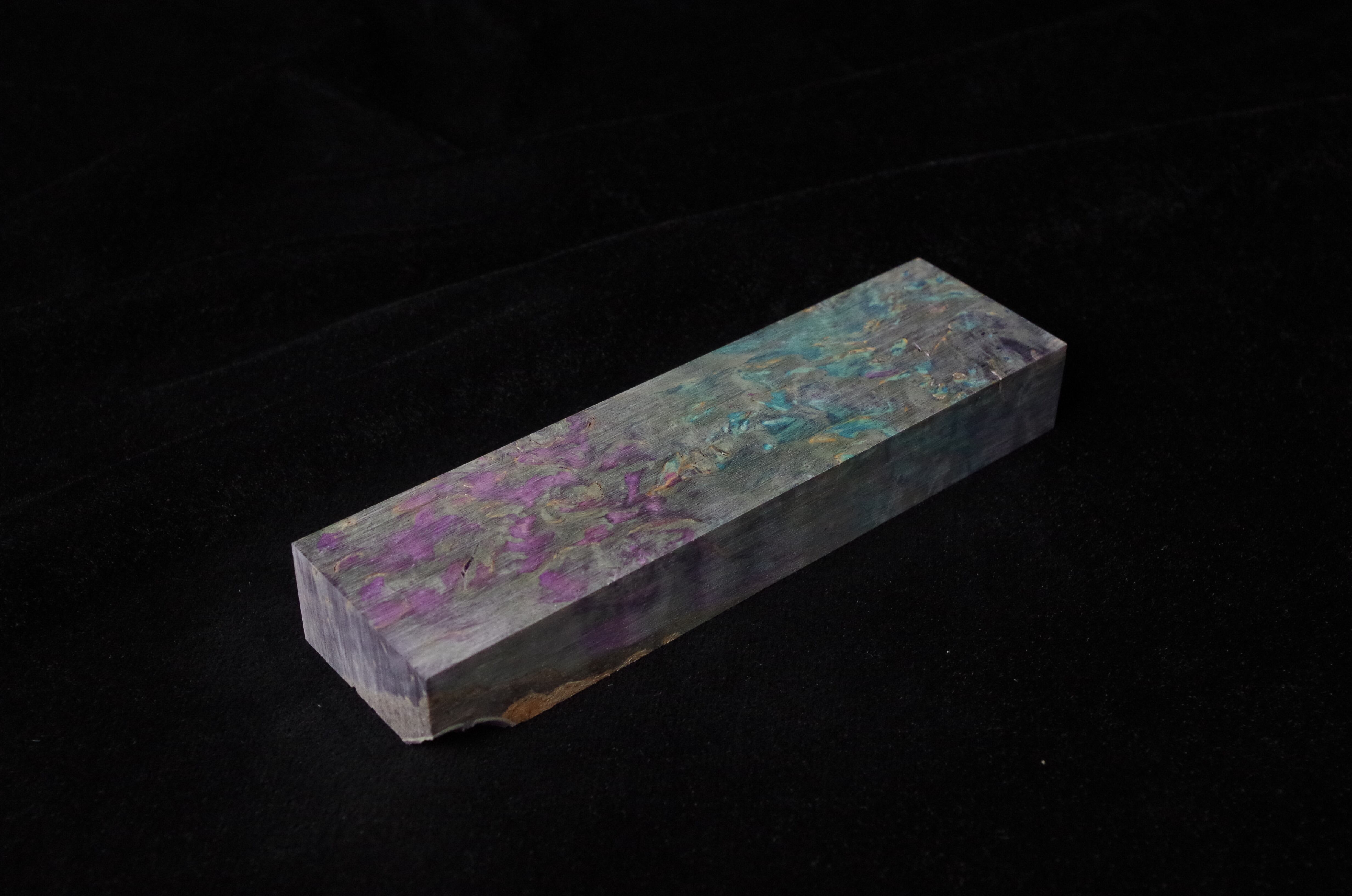 また、樹脂に着色をする事で、木材内部の密度の違いや含水率の違いにより浸透する箇所と浸透しない箇所が現れ、鮮やかで複雑な模様となります。その鮮やかさや強度からナイフハンドルやペンブランクなどに、よく使用されます。