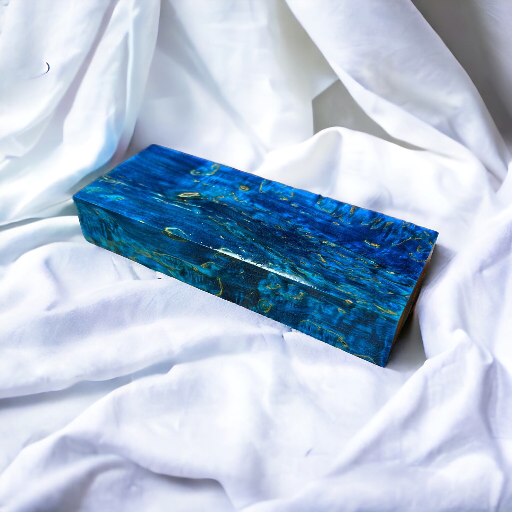 また、樹脂に着色をする事で、木材内部の密度の違いや含水率の違いにより浸透する箇所と浸透しない箇所が現れ、鮮やかで複雑な模様となります。その鮮やかさや強度からナイフハンドルやペンブランクなどに、よく使用されます。