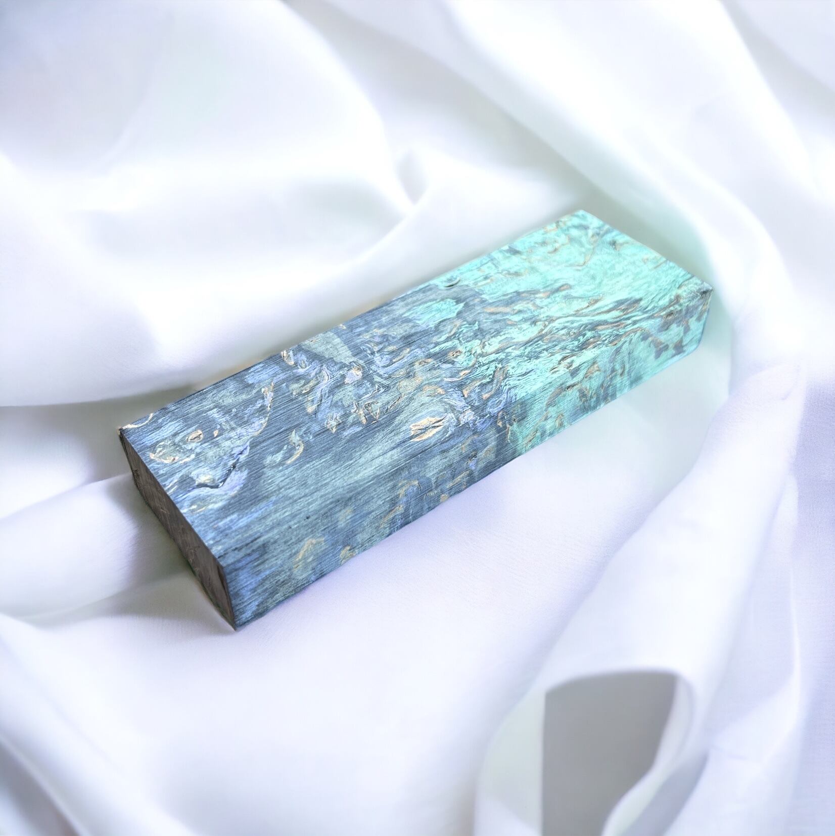 また、樹脂に着色をする事で、木材内部の密度の違いや含水率の違いにより浸透する箇所と浸透しない箇所が現れ、鮮やかで複雑な模様となります。その鮮やかさや強度からナイフハンドルやペンブランクなどに、よく使用されます。