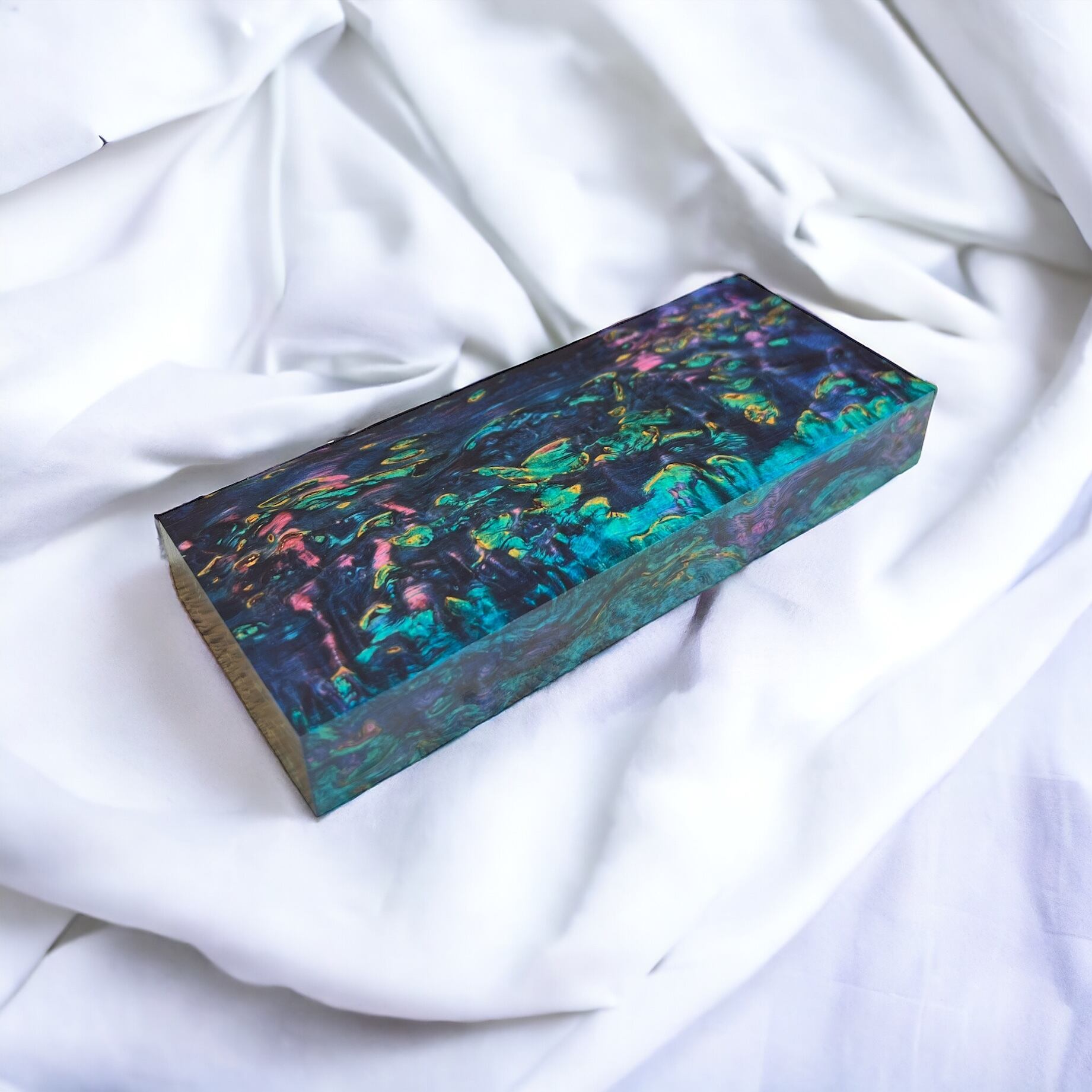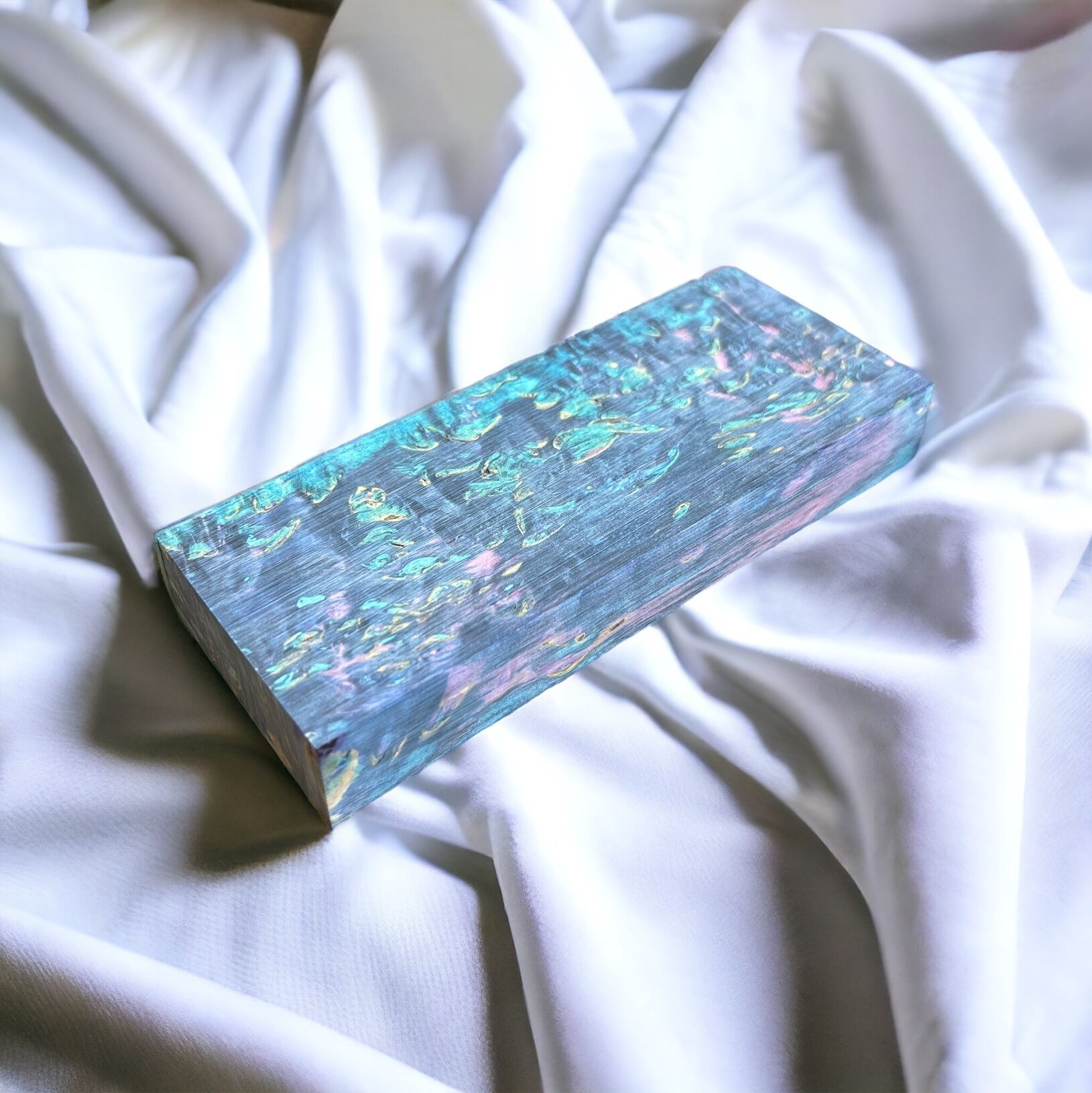 また、樹脂に着色をする事で、木材内部の密度の違いや含水率の違いにより浸透する箇所と浸透しない箇所が現れ、鮮やかで複雑な模様となります。その鮮やかさや強度からナイフハンドルやペンブランクなどに、よく使用されます。