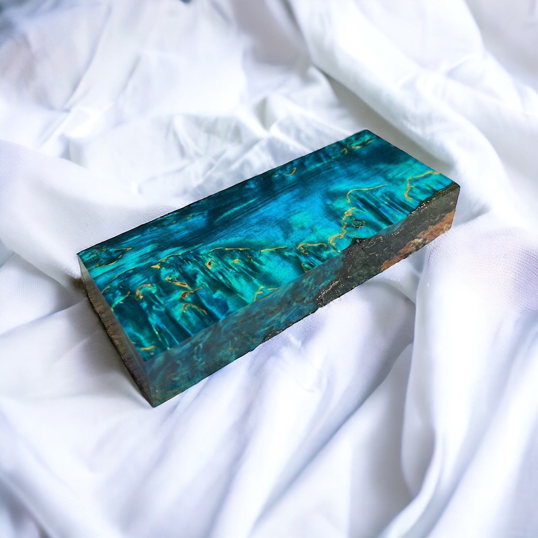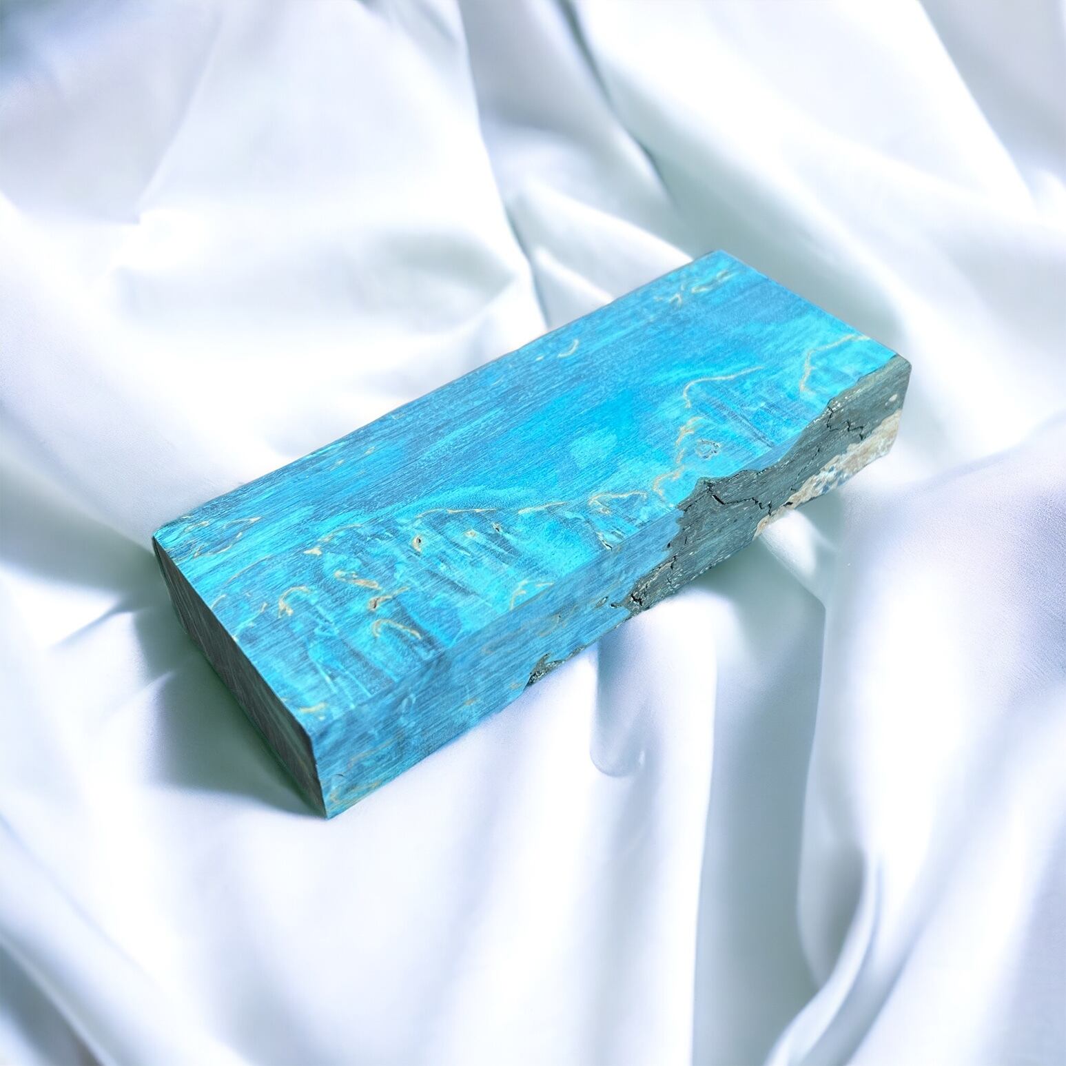 また、樹脂に着色をする事で、木材内部の密度の違いや含水率の違いにより浸透する箇所と浸透しない箇所が現れ、鮮やかで複雑な模様となります。その鮮やかさや強度からナイフハンドルやペンブランクなどに、よく使用されます。