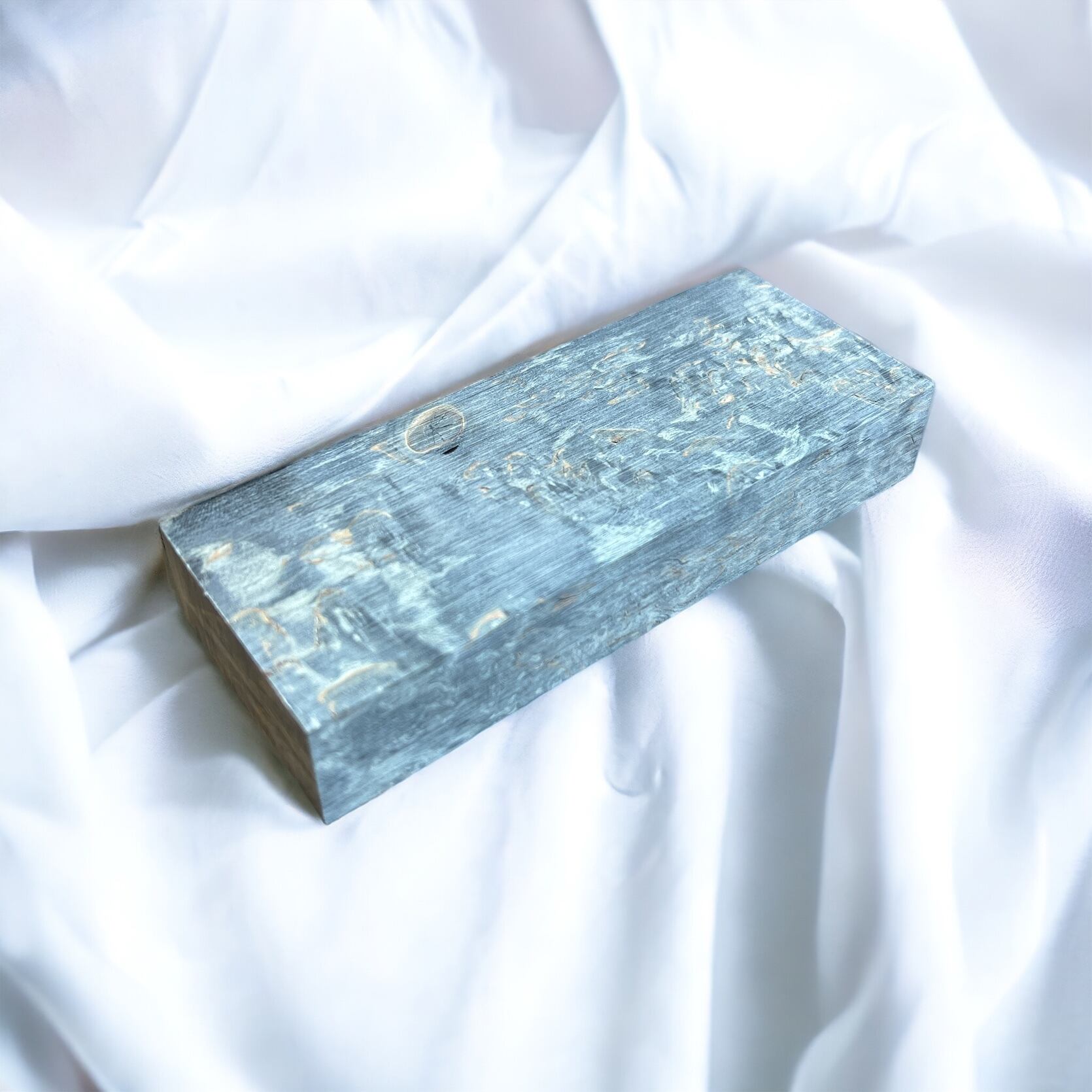 また、樹脂に着色をする事で、木材内部の密度の違いや含水率の違いにより浸透する箇所と浸透しない箇所が現れ、鮮やかで複雑な模様となります。その鮮やかさや強度からナイフハンドルやペンブランクなどに、よく使用されます。