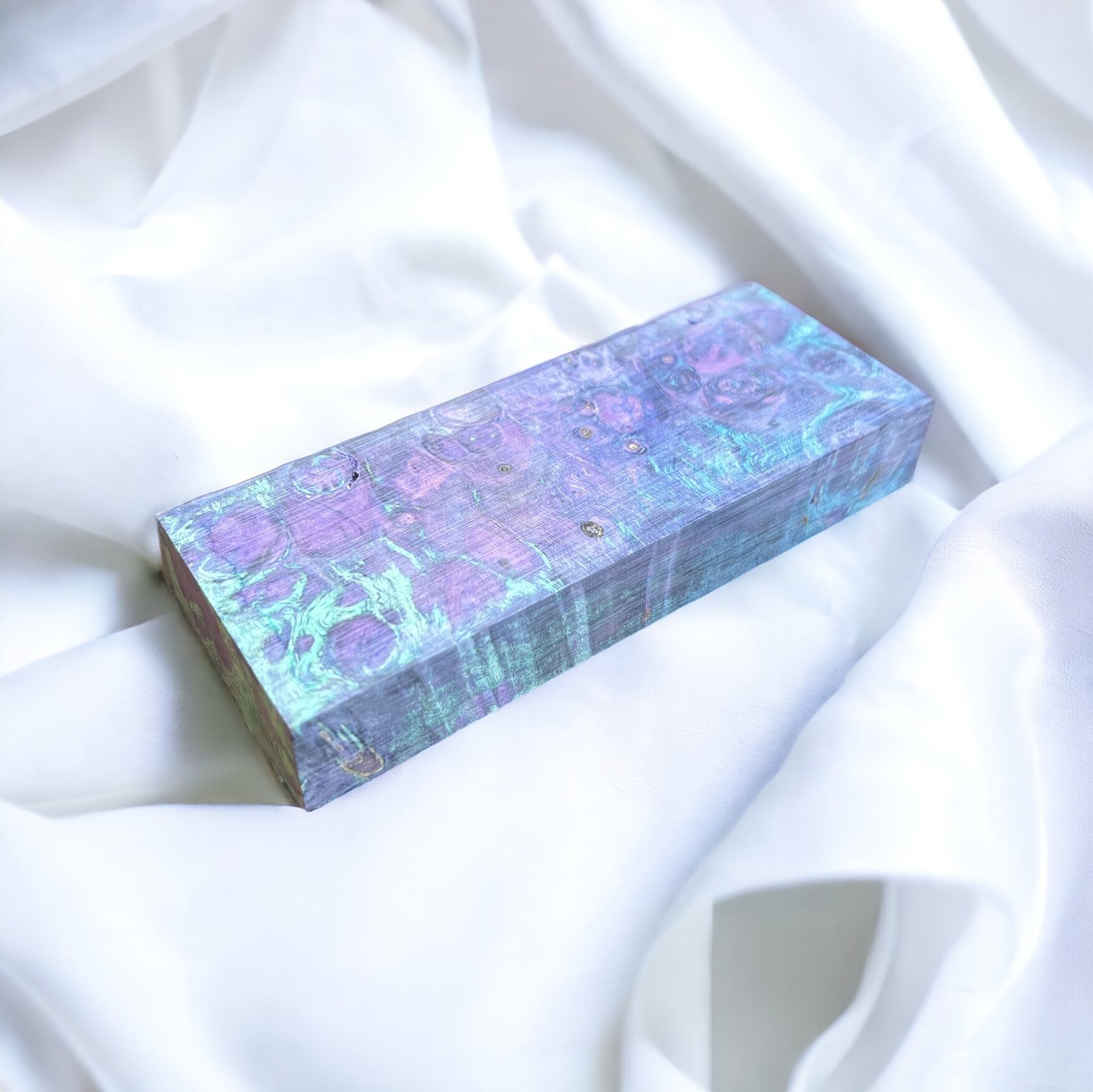 また、樹脂に着色をする事で、木材内部の密度の違いや含水率の違いにより浸透する箇所と浸透しない箇所が現れ、鮮やかで複雑な模様となります。その鮮やかさや強度からナイフハンドルやペンブランクなどに、よく使用されます。
