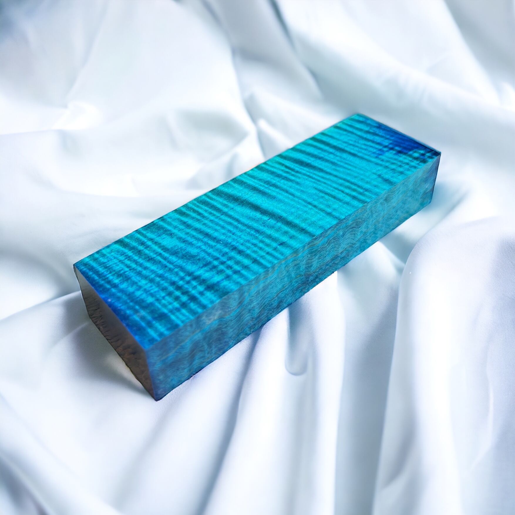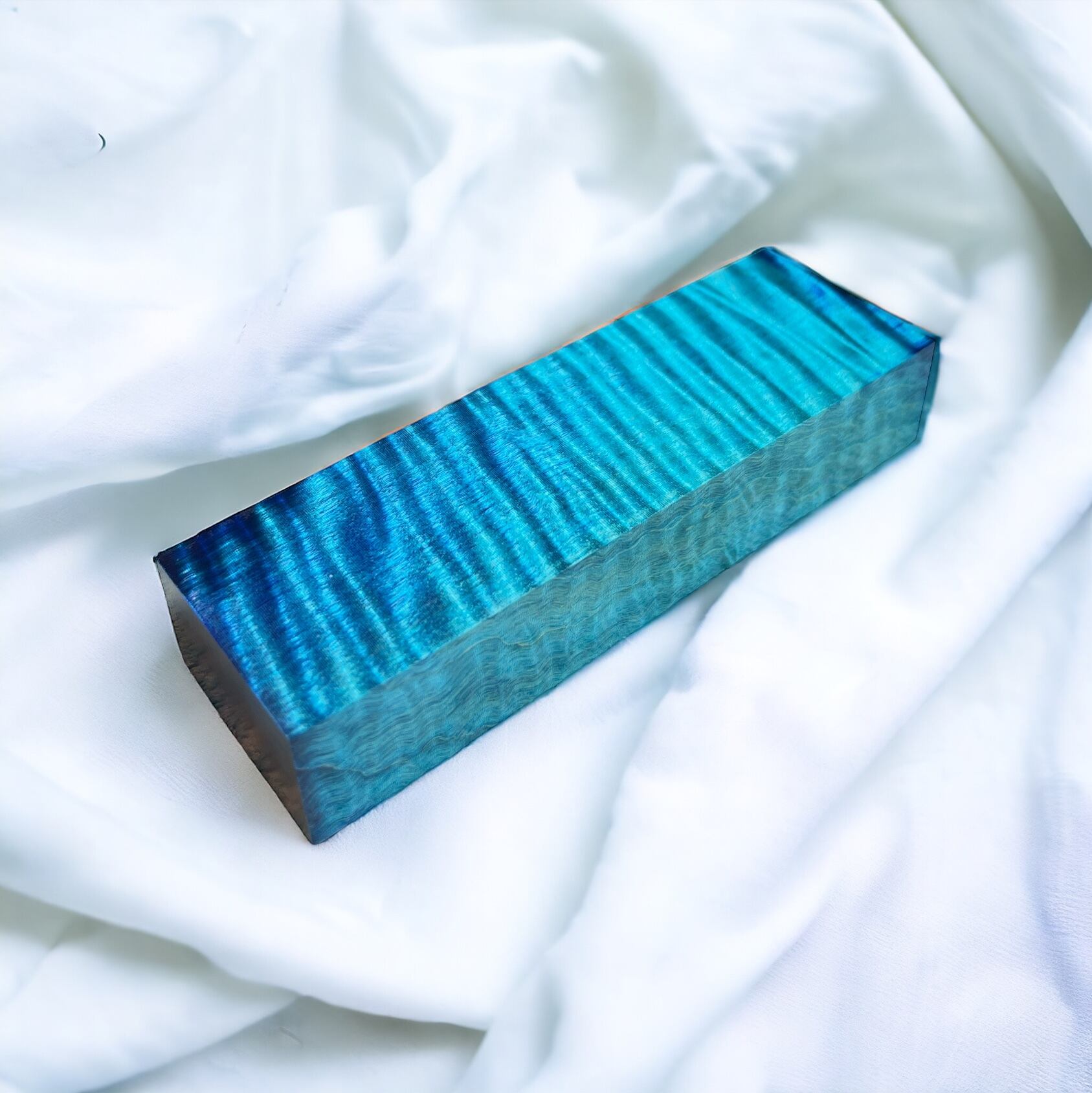 また、樹脂に着色をする事で、木材内部の密度の違いや含水率の違いにより浸透する箇所と浸透しない箇所が現れ、鮮やかで複雑な模様となります。その鮮やかさや強度からナイフハンドルやペンブランクなどに、よく使用されます。
