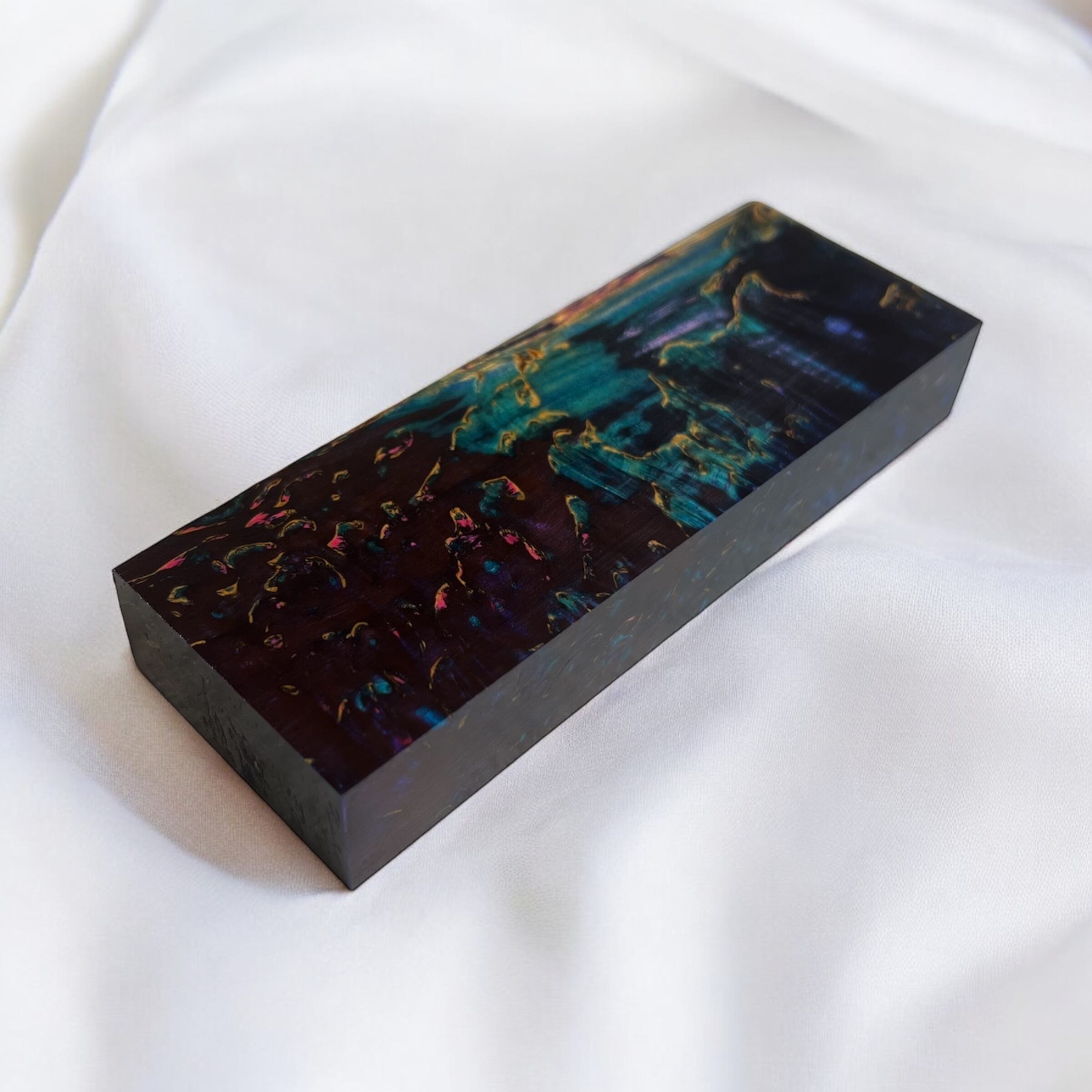 また、樹脂に着色をする事で、木材内部の密度の違いや含水率の違いにより浸透する箇所と浸透しない箇所が現れ、鮮やかで複雑な模様となります。その鮮やかさや強度からナイフハンドルやペンブランクなどに、よく使用されます。