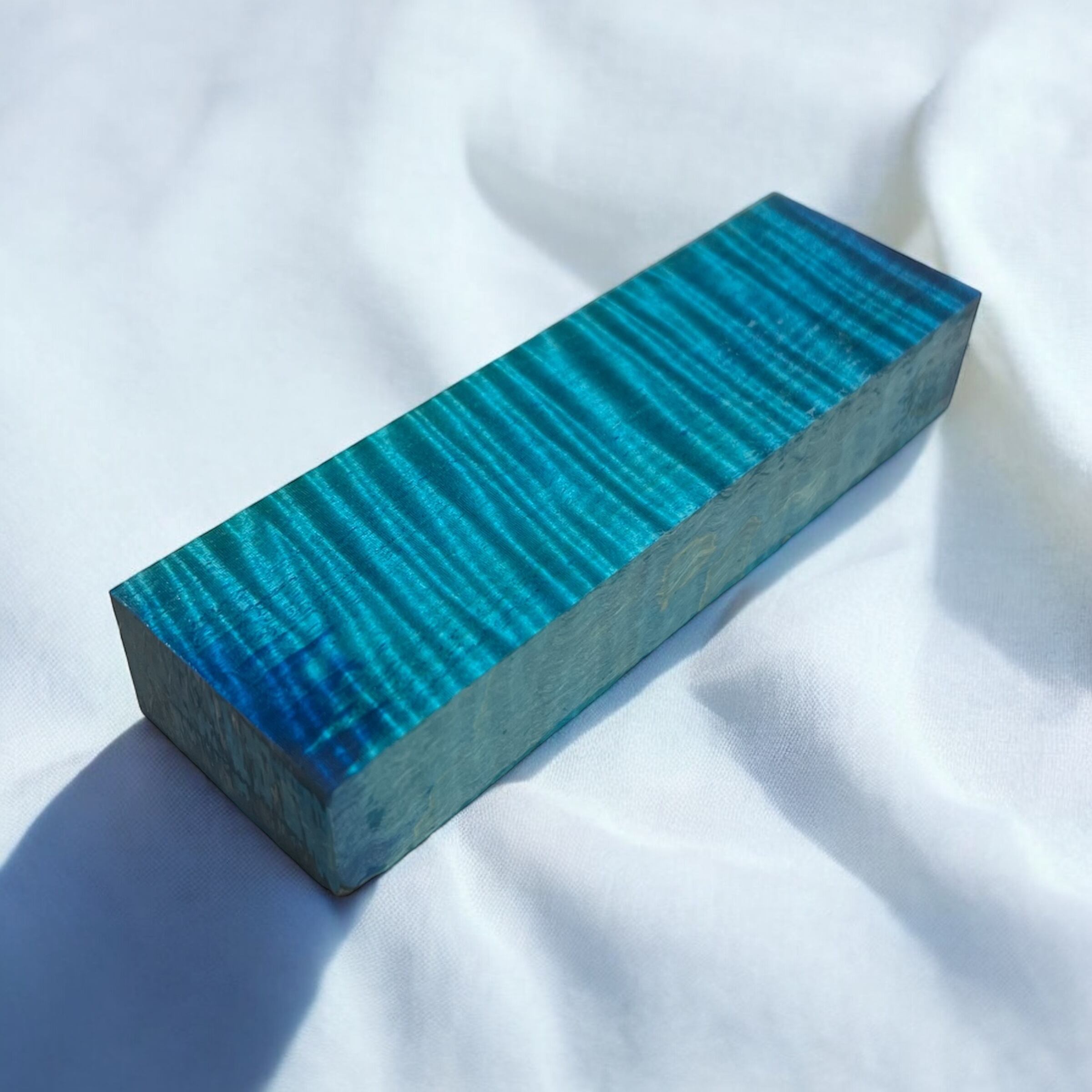 また、樹脂に着色をする事で、木材内部の密度の違いや含水率の違いにより浸透する箇所と浸透しない箇所が現れ、鮮やかで複雑な模様となります。その鮮やかさや強度からナイフハンドルやペンブランクなどに、よく使用されます。