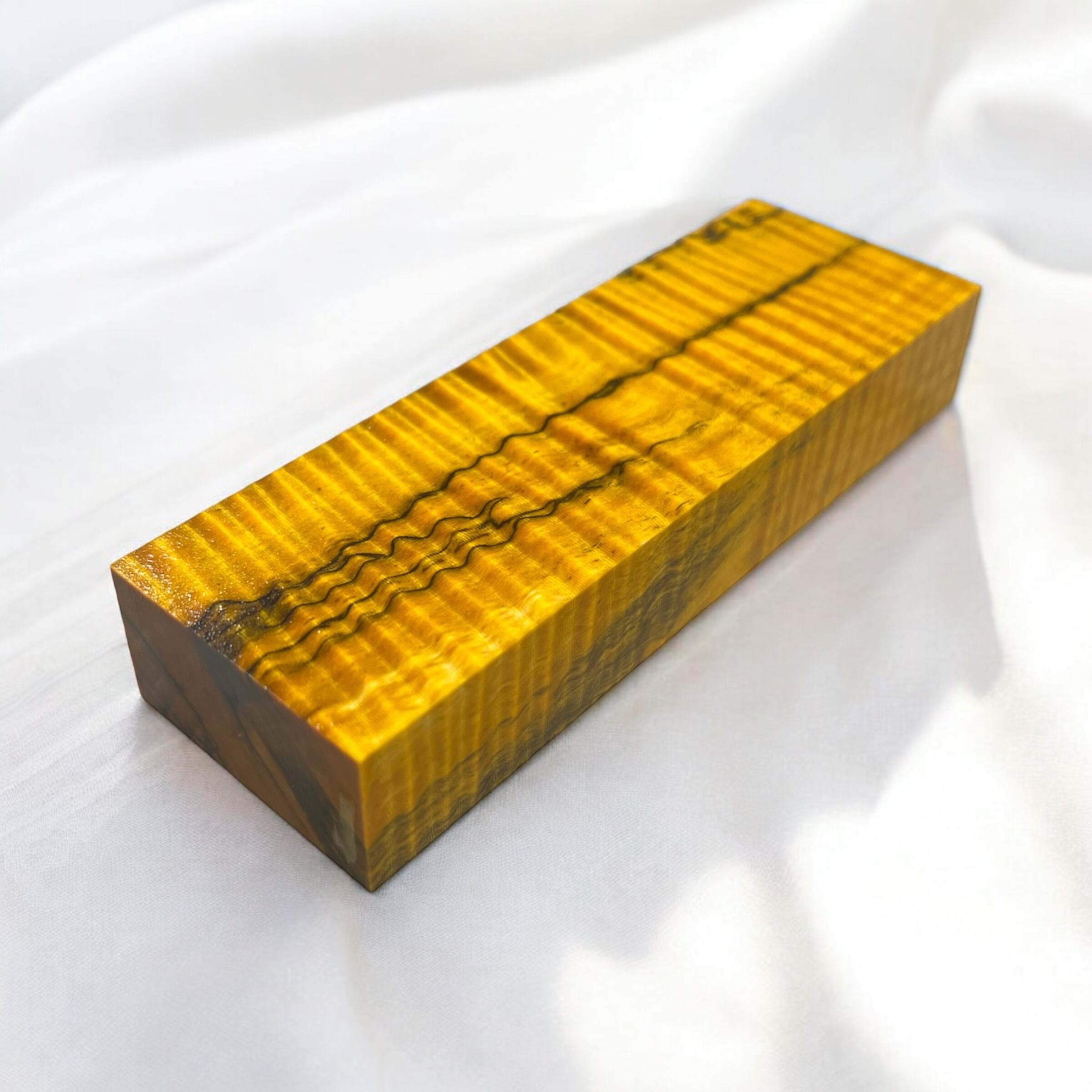 また、樹脂に着色をする事で、木材内部の密度の違いや含水率の違いにより浸透する箇所と浸透しない箇所が現れ、鮮やかで複雑な模様となります。その鮮やかさや強度からナイフハンドルやペンブランクなどに、よく使用されます。